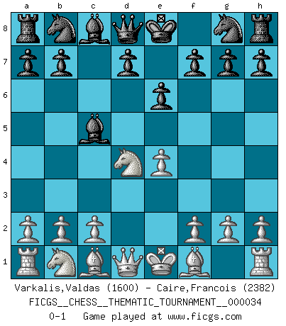 Last move : 0-1 2007 September 11 19:54:53 [Event "FICGS__CHESS__THEMATIC_TOURNAMENT__000034"] [Site "FICGS"] [Date "2007.08.02"] [Round "1"] [White "Varkalis,Valdas"] [Black "Caire,Francois"] [Result "0-1"] [WhiteElo "1600"] [BlackElo "2382"] 1.e4 c5 2.Nf3 e6 3.d4 cxd4 4.Nxd4 Bc5 0-1 This chess game has been lost on time (started : 2007.08.02 17:51:17) Sicilian defense Player Black won this chess game. Follow this game move after move (download)One of these modest little moves may be more embarrassing to your opponent than the biggest threat. (Siegbert Tarrasch) Schach ist mein Leben, meine Leidenschaft, was ich gelernt habe und seit meinem 14. Lebensjahr profimässig praktiziere. Darauf zu verzichten, würde mir sehr schwer fallen. (Viktor Kortschnoi) Algunos sacrificios son sólidos, los demás son míos. (Mikhail Tal) Il vaut mieux sacrifier les pièces de l'adversaire. (Xavier Tartacover) Children in the dark cause accidents, accidents in the dark cause children. (Unknown)