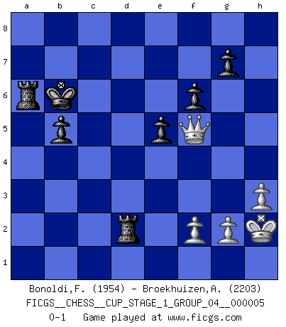 Last move : 0-1 2022 September 30 10:46:56 [Event "FICGS__CHESS__CUP_STAGE_1_GROUP_04__000005"] [Site "FICGS"] [Date "2022.07.16"] [Round "1"] [White "Bonoldi,Fabio"] [Black "Broekhuizen,A. T. S."] [Result "0-1"] [WhiteElo "1954"] [BlackElo "2203"] 1.Nf3 d5 2.c4 d4 3.b4 f6 4.e3 e5 5.c5 a5 6.Qb3 axb4 7.Bc4 Nh6 8.O-O Bxc5 9.exd4 Bxd4 10.Nxd4 Qxd4 11.Bb2 Qb6 12.d4 Nc6 13.Nd2 Nxd4 14.Bxd4 Qxd4 15.Qxb4 Nf5 16.a4 Nd6 17.Rac1 c5 18.Qb6 Ke7 19.Rfd1 Rd8 20.h3 Bd7 21.a5 Bc6 22.a6 Nxc4 23.Nxc4 Qxd1+ 24.Rxd1 Rxd1+ 25.Kh2 Rxa6 26.Qxc5+ Kf7 27.Nd6+ Ke6 28.Nb5 Bxb5 29.Qxb5 Rd7 30.Qb3+ Kd6 31.Qd3+ Kc7 32.Qxh7 b5 33.Qb1 Kb6 34.Qf5 Rd2 0-1 Reti : Advance variation Kingside Castling by player White (move 8) Player Black won this chess game. Follow this game move after move (download)Fischer is under obligation to nobody. (Joseph Platz) Ein unbeabsichtigtes Patt ist der Gipfel der Dummheit. (Anonymous) Nunca nadie ha ganado una partida de Ajedrez rindiendose. (Unknown) Les ravages du H expliquent la différence de niveau entre Tal et Thal [Abergel]. Art is not a thing, it is a way. (Elbert Hubbard)