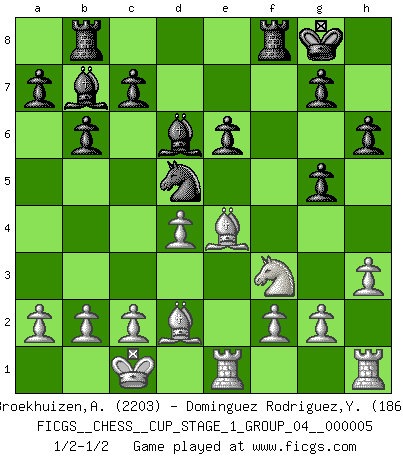 Last move : 1/2-1/2 2022 August 13 18:11:6 [Event "FICGS__CHESS__CUP_STAGE_1_GROUP_04__000005"] [Site "FICGS"] [Date "2022.07.16"] [Round "1"] [White "Broekhuizen,A. T. S."] [Black "Dominguez Rodriguez,Yosvany"] [Result "1/2-1/2"] [WhiteElo "2203"] [BlackElo "1860"] 1.e4 e6 2.d4 d5 3.Nc3 Nf6 4.Bg5 dxe4 5.Nxe4 Nbd7 6.Nf3 h6 7.Nxf6+ Nxf6 8.Be3 Bd6 9.Bd3 O-O 10.Qe2 b6 11.O-O-O Bb7 12.Ne5 Nd5 13.Bd2 Qh4 14.Nf3 Qf6 15.Qe4 Qg6 16.Qxg6 fxg6 17.Be4 Rab8 18.Rde1 g5 19.h3 1/2-1/2 French : Burn variation Kingside Castling by player Black (move 9) Queenside Castling by player White (move 11) This chess game ended in a draw. Follow this game move after move (download)A good sacrifice is one that is not necessarily sound but leaves your opponent dazed and confused. (Rudolph Spielmann) Ihnen, Herr Lasker, habe ich nur drei Worte zu sagen: Schach und matt. (Siegbert Tarrasch) El Ajedrez es tan inspirador que yo no creo que un buen jugador sea capaz de tener un pensamiento malo durante una partida. (Wilhelm Steinitz) La guerre est enfant de la passion, la passion est enfant du narcissisme et le narcissisme est l'enfant. (...) Une autre partie ? (Thibault de Vassal) I've lost money so fast in these clubs it's left me reeling. I've read every poker book ever written, but the only way to get better at the game is to go out and play with people who are really good. The problem is, you stand to lose a lot of money doing it. (Matt Damon)