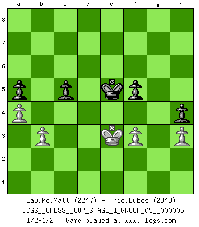 Last move : 1/2-1/2 2022 October 25 15:37:28 [Event "FICGS__CHESS__CUP_STAGE_1_GROUP_05__000005"] [Site "FICGS"] [Date "2022.07.16"] [Round "1"] [White "LaDuke,Matt"] [Black "Fric,Lubos"] [Result "1/2-1/2"] [WhiteElo "2247"] [BlackElo "2349"] 1.e4 e5 2.Nf3 Nc6 3.Bb5 Nf6 4.O-O Nxe4 5.Re1 Nd6 6.Nxe5 Be7 7.Bf1 Nxe5 8.Rxe5 O-O 9.Nc3 Bf6 10.Re1 Re8 11.Nd5 Rxe1 12.Qxe1 b6 13.Qe3 Bb7 14.Nxf6+ Qxf6 15.d3 c5 16.Qf4 Qxf4 17.Bxf4 Nf5 18.a4 f6 19.c3 g5 20.Bd2 Re8 21.f3 a5 22.d4 cxd4 23.Kf2 Bd5 24.cxd4 Kg7 25.Bd3 Nxd4 26.Be3 Nb3 27.Rd1 Nc5 28.Bb5 Re5 29.Bxc5 bxc5 30.Bxd7 Kf7 31.Rd3 Ke7 32.Bb5 Kd6 33.Bc4 Ke6 34.b3 h5 35.g3 h4 36.gxh4 gxh4 37.h3 Rg5 38.Rd1 Rf5 39.Rxd5 Rxd5 40.Ke3 Ke5 41.Bxd5 Kxd5 42.Kd3 f5 43.Ke3 Ke5 1/2-1/2 Ruy Lopez : Berlin defense, Open variation Kingside Castling by player White (move 4) Kingside Castling by player Black (move 8) 10 pieces endgame at move 41 : White KPPPP , Black KPPPP WHITE : King + 4 Pawns BLACK : King + 4 Pawns This chess game ended in a draw. Follow this game move after move (download)I'm not a materialistic person, in that, I don't suffer the lack or loss of money. The absence of worldly goods I don't look back on. For Chess is a way I can be as materialistic as I want without having to sell my soul. (Jamie Walter Adams) Es hat in meinem Leben Zeiten gegeben, da ich sehr nahe daran war zu glauben, daß ich auch nicht eine einzige Schachpartie verlieren könnte. (José Raúl Capablanca) Morphy probablemente fue el genio más grande de todos. (Bobby Fischer) Ce qui est bien, c'est d'avoir tout un tas de pièces en prise : l'adversaire ne peut en prendre qu'une à la fois. Cité par Thierry Audin. Hardware: the parts of a computer that can be kicked. (Jeff Persis)