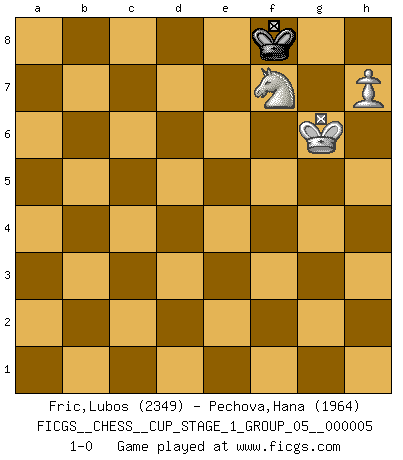 Last move : 1-0 2023 March 20 2:9:6 [Event "FICGS__CHESS__CUP_STAGE_1_GROUP_05__000005"] [Site "FICGS"] [Date "2022.07.16"] [Round "1"] [White "Fric,Lubos"] [Black "Pechova,Hana"] [Result "1-0"] [WhiteElo "2349"] [BlackElo "1964"] 1.e4 e5 2.Nf3 Nc6 3.Bb5 a6 4.Ba4 Nf6 5.O-O Be7 6.Re1 b5 7.Bb3 O-O 8.a4 b4 9.a5 d6 10.c3 Rb8 11.Bc4 Bb7 12.d3 bxc3 13.bxc3 Na7 14.h3 c5 15.Bg5 h6 16.Bxf6 Bxf6 17.Nbd2 Qc7 18.Qa4 Bc6 19.Qc2 Bb5 20.Nf1 Bxc4 21.dxc4 Nc6 22.Ne3 Qd7 23.Red1 Rfe8 24.Nf5 Re6 25.h4 Bd8 26.h5 Kh7 27.Qd2 Rb3 28.g3 Rf6 29.Qc2 Rb8 30.Kg2 Re6 31.Qd3 Bc7 32.Qd5 Qe8 33.Rdb1 Ne7 34.Nxe7 Rxe7 35.Nh4 Rxb1 36.Rxb1 Bxa5 37.Qxd6 Re6 38.Qxc5 Qc6 39.Qd5 Bb6 40.Qxc6 Rxc6 41.Nf5 Bc5 42.Rb7 Kg8 43.Ra7 Bxa7 44.Ne7+ Kf8 45.Nxc6 Bb6 46.Nxe5 Ba5 47.f4 Bxc3 48.Nd7+ Ke7 49.Nc5 a5 50.Na4 Bd4 51.e5 f6 52.Kf3 fxe5 53.Ke4 Ke6 54.g4 Kd6 55.f5 Bf2 56.g5 Bh4 57.c5+ Ke7 58.g6 Kd7 59.Kxe5 Kc6 60.Kd4 Bf6+ 61.Kd3 Be7 62.Kc4 Bf6 63.Nc3 Be7 64.Ne4 Bf8 65.Kc3 Kb5 66.Kb3 Be7 67.f6 a4+ 68.Ka3 Bf8 69.Nd6+ Kxc5 70.fxg7 Bxg7 71.Nf5 Bf6 72.g7 Bxg7 73.Nxg7 Kd5 74.Nf5 Ke5 75.Nxh6 Kf6 76.Ng4+ Kg5 77.h6 Kg6 78.Kxa4 Kh7 79.Kb4 Kg6 80.Kc5 Kf7 81.Kd6 Kf8 82.Ne5 Kg8 83.Ke7 Kh7 84.Nf7 Kg8 85.Kf6 Kh7 86.Kg5 Kg8 87.Kg6 Kf8 88.h7 1-0 Ruy Lopez : Closed, 7...O-O Kingside Castling by player White (move 5) Kingside Castling by player Black (move 7) 10 pieces endgame at move 69 : White KNPPP , Black KBPPP WHITE : King + 1 Knight 3 Pawns BLACK : King + 1 Bishop 3 Pawns 9 pieces endgame at move 70 : White KNPPP , Black KBPP WHITE : King + 1 Knight 3 Pawns BLACK : King + 1 Bishop 2 Pawns 8 pieces endgame at move 70 : White KNPP , Black KBPP WHITE : King + 1 Knight 2 Pawns BLACK : King + 1 Bishop 2 Pawns 7 pieces endgame at move 72 : White KNP , Black KBPP WHITE : King + 1 Knight 1 Pawn BLACK : King + 1 Bishop 2 Pawns 6 pieces endgame at move 73 : White KNP , Black KPP WHITE : King + 1 Knight 1 Pawn BLACK : King + 2 Pawns 5 pieces endgame at move 75 : White KNP , Black KP WHITE : King + 1 Knight 1 Pawn BLACK : King + 1 Pawn 4 pieces endgame at move 78 : White KNP , Black K WHITE : King + 1 Knight 1 Pawn BLACK : King + Player White won this chess game. Follow this game move after move (download)I feel as if I were a piece in a game of Chess, when my opponent says of it: That piece cannot be moved. (Soren Kierkegaard) Je mehr ich von der FIDE weiss, um so weniger verstehe ich. (Alexander Kalifman) Juega la Apertura como un libro, el Juego Medio como un mago y los Finales como una máquina. (Spielmann) À la honte des hommes, on sait que les lois du jeu sont les seules qui soient partout justes, claires, inviolables et exécutées. Pourquoi l'Indien qui a donné les règles du jeu d'échecs est-il obéi de bon gré dans toute la terre, et que les décrétales des papes, par exemple, sont aujourd'hui un objet d'horreur et de mépris ? C'est que l'inventeur des échecs combina tout avec justesse pour la satisfaction des joueurs, et que les papes, dans leurs décrétales, n'eurent en vue que leur seul avantage. L'Indien voulut exercer également l'esprit des hommes et leur donner du plaisir; les papes ont voulu abrutir l'esprit des hommes. Voltaire (Dictionnaire philosophique / Garnier 1967) There is far too much law for those who can afford it and far too little for those who cannot. (Derek Bok)