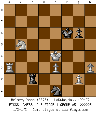 Last move : 1/2-1/2 2022 November 16 3:54:27 [Event "FICGS__CHESS__CUP_STAGE_1_GROUP_05__000005"] [Site "FICGS"] [Date "2022.07.16"] [Round "1"] [White "Helmer,Janos"] [Black "LaDuke,Matt"] [Result "1/2-1/2"] [WhiteElo "2278"] [BlackElo "2247"] 1.Nf3 d5 2.d4 h6 3.c4 e6 4.Nc3 Nf6 5.Bf4 a6 6.e3 c5 7.cxd5 Nxd5 8.Nxd5 exd5 9.dxc5 Bxc5 10.a3 Nc6 11.Bd3 Ba7 12.O-O Qf6 13.Bc2 d4 14.Qd3 dxe3 15.Bxe3 Bxe3 16.Rae1 g6 17.Qe4+ Be6 18.fxe3 Qxb2 19.Rb1 Qxa3 20.Rxb7 O-O 21.Qf4 Qc3 22.Bxg6 fxg6 23.Qxh6 Bf7 24.Ng5 Qg7 25.Qxg7+ Kxg7 26.R1xf7+ Rxf7 27.Rxf7+ Kg8 28.Rc7 Nb4 29.Ne4 Nd5 30.Rc6 Kg7 31.Kf2 a5 32.Rd6 Ne7 33.Rd7 Kf7 34.Rd3 Nc8 35.Nc3 a4 36.Nb5 Rb8 37.Nd4 Nb6 38.Ra3 Rh8 39.h3 Ra8 40.Ke2 Nc4 41.Ra2 a3 42.Kd3 Nb2+ 43.Kc3 Rc8+ 44.Kd2 Nc4+ 45.Kd3 Kf6 46.Nb5 Nb2+ 47.Ke2 Rc2+ 48.Kf3 Nd3 49.Rxa3 Ne1+ 50.Ke4 1/2-1/2 Reti Opening Kingside Castling by player White (move 12) Kingside Castling by player Black (move 20) 10 pieces endgame at move 49 : White KRNPPP , Black KRNP WHITE : King + 1 Rook 1 Knight 3 Pawns BLACK : King + 1 Rook 1 Knight 1 Pawn This chess game ended in a draw. Follow this game move after move (download)Without error there can be no brilliancy. (Emanuel Lasker) Zeige mir drei Eröffnungsvarianten und ich beweise dir, dass zwei davon inkorrekt sind. (Emanuel Lasker) Después de una mala apertura, hay una esperanza en el juego medio. Pero una vez que estas en finales, el momento de la verdad ha llegado. (Edmar Mednis) Mais l'homme est une créature légère et illogique : semblable au joueur d'échecs, il n'aime que le processus du but à atteindre, non le but lui-même. (Dostoïevsky) Luck is the residue of design. (John Milton)