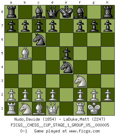 Last move : 0-1 2022 September 19 11:57:37 [Event "FICGS__CHESS__CUP_STAGE_1_GROUP_05__000005"] [Site "FICGS"] [Date "2022.07.16"] [Round "1"] [White "Nudo,Davide"] [Black "LaDuke,Matt"] [Result "0-1"] [WhiteElo "1854"] [BlackElo "2247"] 1.e4 e5 2.Nf3 Nc6 3.Bb5 Nf6 4.O-O Nxe4 0-1 Ruy Lopez : Berlin defense, Open variation Kingside Castling by player White (move 4) Player Black won this chess game. Follow this game move after move (download)A Chess game is divided into three stages: the first, when you hope you have the advantage, the second when you believe you have an advantage, and the third... when you know you're going to lose ! (Savielly Tartakower) Ich verachte die Medien. (Robert James Fischer) Morphy probablemente fue el genio más grande de todos. (Bobby Fischer) Pour se monter efficace, un Cavalier a besoin d'avant-postes ! Les Cavaliers font les meilleurs bloqueurs de pions passés. Employ the attack like tactic of defense. (Chinese proverb)