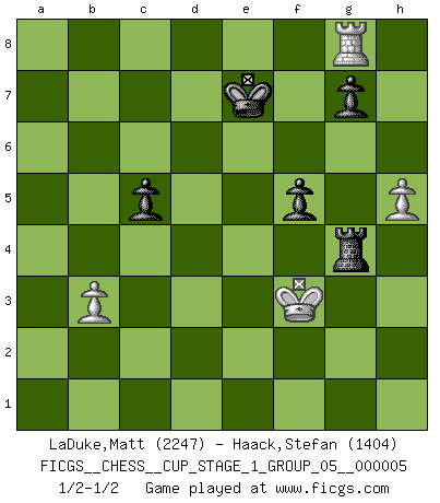 Last move : 1/2-1/2 2022 November 6 3:31:33 [Event "FICGS__CHESS__CUP_STAGE_1_GROUP_05__000005"] [Site "FICGS"] [Date "2022.07.16"] [Round "1"] [White "LaDuke,Matt"] [Black "Haack,Stefan"] [Result "1/2-1/2"] [WhiteElo "2247"] [BlackElo "1404"] 1.e4 e5 2.Nf3 Nc6 3.Bb5 a6 4.Ba4 Nf6 5.O-O b5 6.Bb3 Be7 7.d4 d6 8.dxe5 Nxe5 9.Nxe5 dxe5 10.Qxd8+ Bxd8 11.Be3 Bb7 12.Nd2 Nxe4 13.Nxe4 Bxe4 14.a4 f5 15.f3 Bc6 16.Rfe1 bxa4 17.Bxa4 Bxa4 18.Rxa4 Bf6 19.Bd4 O-O-O 20.Bc3 Kb7 21.Bxe5 Rhe8 22.Bg3 Rd4 23.Rxe8 Rxa4 24.b3 Ra2 25.Re2 a5 26.Be5 Bxe5 27.Rxe5 Rxc2 28.Rxa5 c5 29.h4 h5 30.g4 Rc3 31.gxh5 Kb6 32.Ra8 Rxf3 33.Rg8 Rg3+ 34.Kh2 Rg4 35.Rb8+ Kc7 36.Rh8 Rxh4+ 37.Kg3 Rg4+ 38.Kf3 Kd6 39.Rg8 Ke7 1/2-1/2 Ruy Lopez : 5.O-O Kingside Castling by player White (move 5) Queenside Castling by player Black (move 19) 10 pieces endgame at move 32 : White KRPPP , Black KRPPP WHITE : King + 1 Rook 3 Pawns BLACK : King + 1 Rook 3 Pawns 9 pieces endgame at move 36 : White KRPP , Black KRPPP WHITE : King + 1 Rook 2 Pawns BLACK : King + 1 Rook 3 Pawns This chess game ended in a draw. Follow this game move after move (download)Botvinnik tried to take the mystery out of Chess, always relating it to situations in ordinary life. He used to call Chess a typical inexact problem similar to those which people are always having to solve in everyday life. (Garry Kasparov) Schach ist ein Kampf gegen den Fehler. (Johannes Herrman Zukertort) El arma más poderosa en el Ajedrez, es tener la próxima movida. (David Bronstein) Avant la finale, les dieux ont créé le milieu de partie. (Tarrasch) I find television to be very educating. Every time somebody turns on the set, I go in the other room and read a book. (Groucho Marx)