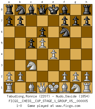 Last move : 1-0 2022 September 20 0:1:8 [Event "FICGS__CHESS__CUP_STAGE_1_GROUP_05__000005"] [Site "FICGS"] [Date "2022.07.16"] [Round "1"] [White "Tabudlong,Ronnie"] [Black "Nudo,Davide"] [Result "1-0"] [WhiteElo "2207"] [BlackElo "1854"] 1.d4 Nf6 2.c4 c5 3.d5 e6 4.Nc3 exd5 5.cxd5 d6 6.e4 1-0 Benoni : 6.e4 Player White won this chess game. Follow this game move after move (download)Different people feel differently about resigning. (Bobby Fischer) Ein typischer, sehr verbreiteter Gedankenschädling ist der, daß der betreffende Amateur von der Annanhme ausgeht, daß jeder einzelne Zug etwas zu leisten habe. (Aaron Nimzowitsch) El ganador de una partida es aquel jugador que hace el penúltimo error. (Savielly Tartakover) L'ordinateur a tué l'originalité. Il n'y a plus guère d'aventures sur l'échiquier. (Jacob Murray) Pretend inferiority and encourage his arrogance. (Sun Tzu)