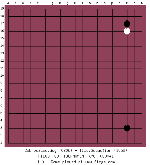 Last move : 1-0 2007 September 4 1:0:10 [Event "FICGS__GO__TOURNAMENT_KYU__000041"] [Site "FICGS"] [Date "2007.08.03"] [Round "1"] [Black "Sobrecases,Guy"] [White "Ilie,Sebastian"] [Result "1-0"] [Rating 1 "0206"] [Rating 2 "1068"] 1.r3 r16 2.r17 1-0 This go game has been lost on time (started : 2007.08.03 11:16:18) Here are the names of the openings (joseki) played in the four corners : Corner q16 : r16 r17 Komoku (Somok, Xiao~mu`) 3-4 Point. The komoku (3-4) point is the traditional corner enclosure move.. This is not joseki. n invasion to take the corner after White made a shimari-less moyo on top disabling the other moves. Corner q4 : r3 1-0 San-San (Sam-Sam, San-San) 3-3 Point. The San-San (3-3) point, emphasizing territory at the expense of influence. Player Black won this Go (weiqi, baduk) game. Follow this game move after move (download)The rectangular six is normally alive. (Anonymous) There's no money in correspondence chess. (John Knudsen)