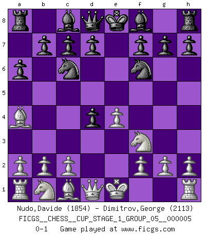 Last move : 0-1 2022 September 21 14:30:58 [Event "FICGS__CHESS__CUP_STAGE_1_GROUP_05__000005"] [Site "FICGS"] [Date "2022.07.16"] [Round "1"] [White "Nudo,Davide"] [Black "Dimitrov,George"] [Result "0-1"] [WhiteElo "1854"] [BlackElo "2113"] 1.e4 e5 2.Nf3 Nc6 3.Bb5 a6 4.Ba4 Nf6 5.d4 exd4 0-1 Ruy Lopez : Morphy defense Player Black won this chess game. Follow this game move after move (download)Spassky will not be psyched out by Fischer. (Mike Goodall) Ich liebe den Moment, wenn ich das Ego meines Gegenüber breche. (Robert James Fischer) Fischer sacrificó virtualmente todo lo que la mayoría de nosotros los 'debiles' (término que él usa) valoramos, respetamos y apreciamos por el amor de un astuto, a menudo hermoso tablero de juego, por el privilegio ambivalente de ser su mas grande maestro. (Paul Kollar) Les échecs, c'est l'imagination. (David Bronstein) They say in chess you've got to kill the queen, and then you mate it... Oh I, do you ? (Red Hot Chili Peppers, Fortune faded)