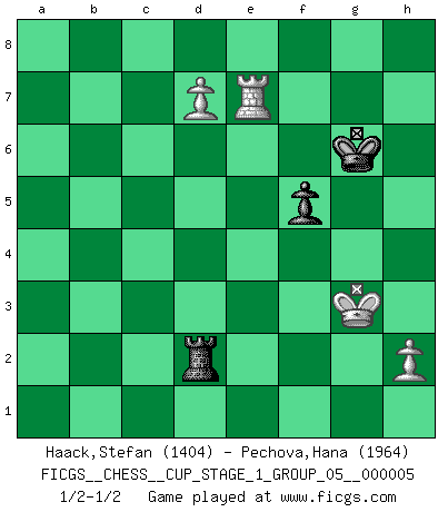 Last move : 1/2-1/2 2022 December 28 22:48:44 [Event "FICGS__CHESS__CUP_STAGE_1_GROUP_05__000005"] [Site "FICGS"] [Date "2022.07.16"] [Round "1"] [White "Haack,Stefan"] [Black "Pechova,Hana"] [Result "1/2-1/2"] [WhiteElo "1404"] [BlackElo "1964"] 1.e4 c5 2.Nf3 Nc6 3.d4 cxd4 4.Nxd4 Nf6 5.Nc3 e5 6.Ndb5 d6 7.Bg5 a6 8.Bxf6 gxf6 9.Na3 b5 10.Nd5 f5 11.Bd3 Be6 12.O-O Bxd5 13.exd5 Ne7 14.Nxb5 Bg7 15.Nc3 e4 16.Bc4 Ng6 17.Qh5 Bxc3 18.bxc3 Qf6 19.Qh6 Rg8 20.Rab1 Qh4 21.Qe3 Kf8 22.Be2 Nf4 23.g3 Nxe2+ 24.Qxe2 Re8 25.Kh1 Qg5 26.Rb6 Rg6 27.f4 exf3 28.Qxf3 Rf6 29.Qf4 Qxf4 30.Rxf4 Re2 31.Rxa6 Rxc2 32.Rf3 Rc1+ 33.Kg2 Rc2+ 34.Rf2 Rxc3 35.a4 Ra3 36.a5 Kg7 37.Ra8 f4 38.Rxf4 Rxf4 39.gxf4 Kg6 40.Ra6 Kf5 41.Rxd6 Rxa5 42.Rd7 f6 43.Rxh7 Kxf4 44.d6 Rd5 45.d7 Rd2+ 46.Kh3 f5 47.Rf7 Kg5 48.Kg3 Kg6 49.Re7 Kf6 50.Rh7 Kg6 51.Re7 Kf6 52.Rh7 Kg6 53.Re7 1/2-1/2 Sicilian : Pelikan (Lasker/Sveshnikov) variation Kingside Castling by player White (move 12) 10 pieces endgame at move 41 : White KRPPPP , Black KRPP WHITE : King + 1 Rook 4 Pawns BLACK : King + 1 Rook 2 Pawns 9 pieces endgame at move 41 : White KRPPP , Black KRPP WHITE : King + 1 Rook 3 Pawns BLACK : King + 1 Rook 2 Pawns 8 pieces endgame at move 43 : White KRPPP , Black KRP WHITE : King + 1 Rook 3 Pawns BLACK : King + 1 Rook 1 Pawn 7 pieces endgame at move 43 : White KRPP , Black KRP WHITE : King + 1 Rook 2 Pawns BLACK : King + 1 Rook 1 Pawn This chess game ended in a draw. Follow this game move after move (download)Fischer was a master of clarity and a king of artful positioning. His opponents would see where he was going but were powerless to stop him. (Bruce Pandolfini) Wenn ein Kopf und ein Buch zusammenstoßen und es klingt hohl, ist es denn allemal im Buche? (Georg Christoph Lichtenberg) Al jugar al Ajedrez entonces, podemos aprender: Primero: Previsión... Segundo: Prudencia... Tercero: Cautela... Y al final, aprendemos del Ajedrez el hábito de no ser desanimados por apariencias malas presentes en el estado de nuestros asuntos, el hábito de la esperanza por una oportunidad favorable y la perseveración de los secretos de los recursos. (Benjamin Franklin) Votre prénom est 'Tactique', votre deuxième prénom est 'Tactique' et votre nom est 'Tactique'. (Ken Smith) God, you are such an idiot. - Actually, I thought I was more of a jerk. (Gregory House to Stacy Warner, House M.D.)