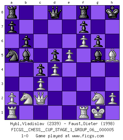 Last move : 1-0 2022 November 20 8:39:56 [Event "FICGS__CHESS__CUP_STAGE_1_GROUP_06__000005"] [Site "FICGS"] [Date "2022.07.16"] [Round "1"] [White "Hybl,Vladislav"] [Black "Faust,Dieter"] [Result "1-0"] [WhiteElo "2339"] [BlackElo "1998"] 1.e4 e6 2.d4 d5 3.Nc3 Nf6 4.e5 Nfd7 5.f4 c5 6.Nf3 Nc6 7.Be3 Qb6 8.Na4 Qa5+ 9.c3 b6 10.Bd2 c4 11.b4 Qa6 12.Be2 Qb7 13.O-O Be7 14.Qc2 Nf8 15.Nb2 Ng6 16.g4 Qd7 17.Ng5 Qd8 18.Be3 h6 19.Nh3 Bd7 20.f5 Nh4 21.b5 Na5 22.Bf2 exf5 23.Bxh4 Bxh4 24.gxf5 Bxb5 25.Nf4 Bg5 26.Nh5 O-O 27.f6 g6 28.Nf4 Kh8 29.Ng2 h5 30.Bxh5 1-0 French : Steinitz, Boleslavsky variation Kingside Castling by player White (move 13) Kingside Castling by player Black (move 26) Player White won this chess game. Follow this game move after move (download)The tactician must know what to do whenever something needs doing; the strategist must know what to do when nothing needs doing. (Savielly Tartakover) Schach ist wie eine schöne Frau, zu der wir ständig zurückkehren, gleichviel, wie oft sie uns zurückweist. (Anonymous) El arma más poderosa en el Ajedrez, es tener la próxima movida. (David Bronstein) Mais n'est-ce pas déjà le limiter injurieusement que d'appeler les échecs un jeu? N'est-ce pas aussi une science, un art, ou quelque chose qui, comme le cercueil de Mahomet entre ciel et terre, est suspendu entre l'un et l'autre, et qui réunit un nombre incroyable de contraires ? (Stefan Zweig) After growing wildly for years, the field of computing appears to be reaching its infancy. (John Pierce)