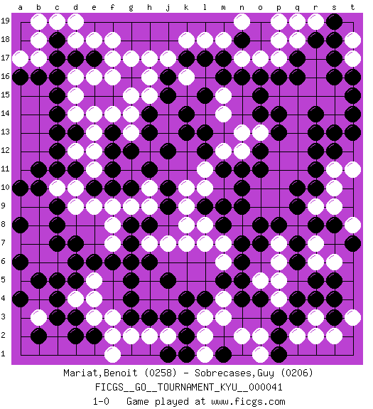 Last move : 1-0 2008 May 12 9:41:1 [Event "FICGS__GO__TOURNAMENT_KYU__000041"] [Site "FICGS"] [Date "2007.08.03"] [Round "1"] [Black "Mariat,Benoit"] [White "Sobrecases,Guy"] [Result "1-0"] [Rating 1 "0258"] [Rating 2 "0206"] 1.q16 r15 2.r4 r16 3.q17 r17 4.n16 q15 5.d3 o17 6.o16 p17 7.p16 n17 8.m17 m18 9.l17 l18 10.k17 k18 11.c16 q18 12.q10 h17 13.e17 g17 14.c11 j17 15.k14 f18 16.k4 e18 17.c18 e16 18.d17 d16 19.c15 f16 20.p13 d18 21.j9 d15 22.c14 b17 23.c17 c19 24.p3 d12 25.c12 g15 26.c5 f14 27.e10 b18 28.j15 d19 29.r13 b19 30.d13 e12 31.h13 e13 32.c9 f17 33.b16 d14 34.c13 a17 35.p14 p15 36.o15 p12 37.o12 p11 38.o11 p10 39.q9 o10 40.m11 q12 41.r12 q13 42.o14 q14 43.r11 s10 44.q7 r9 45.r8 s9 46.s8 s11 47.s12 q11 48.r10 n13 49.n10 p9 50.p8 r6 51.q6 r7 52.r5 s6 53.o8 r3 54.q3 r2 55.s5 q2 56.p2 p4 57.q4 p5 58.n4 p6 59.n6 o5 60.n5 d10 61.d11 d9 62.c8 e9 63.f10 c10 64.b10 b8 65.c7 c6 66.d6 b6 67.b5 b7 68.d7 f9 69.g10 f8 70.f6 a5 71.g8 g9 72.h8 e5 73.d5 e4 74.g3 e3 75.d2 d4 76.c4 b3 77.c3 b9 78.b11 a9 79.b2 n8 80.n9 p7 81.o7 n12 82.n11 o13 83.m16 m15 84.l15 m14 85.l13 m12 86.l12 k16 87.j16 e11 88.h11 o9 89.m8 f2 90.e2 f3 91.g4 g2 92.j3 j2 93.k2 h2 94.t15 s14 95.t14 s15 96.t16 t17 97.t13 t11 98.s17 t18 99.s18 j14 100.h14 j13 101.j12 h9 102.j10 f7 103.g6 j7 104.e6 h5 105.g5 j4 106.j5 h4 107.h6 h7 108.g7 m7 109.n7 l11 110.r18 p18 111.s16 r19 112.s13 l3 113.h3 f1 114.k3 t8 115.t7 g14 116.r14 l7 117.o4 l8 118.l9 l10 119.s3 s2 120.q19 p19 121.s19 q19 122.a16 k7 123.g12 h16 124.f13 g13 125.n18 n19 126.f12 e14 127.f11 h15 128.k13 k9 129.m9 k8 130.l4 m3 131.a6 a7 132.a4 k10 133.a10 m6 134.a6 l2 135.j1 t3 136.s4 o2 137.p1 n2 138.pass o1 139.m1 l1 140.k1 m4 141.m5 h10 142.a8 1-0 This go game has been lost on time (started : 2007.08.03 11:16:18) Here are the names of the openings (joseki) played in the four corners : Corner q16 : q16 r15 Hoshi (Hwajeom, Seongjeom, Xingwei`) 4-4 Point. The star or hoshi (4-4) point, emphasizing influence at the potential expense of territory. Corner d16 : c16 h17 Komoku (Somok, Xiao~mu`) 3-4 Point. The komoku (3-4) point is the traditional corner enclosure move.. Player Black won this Go (weiqi, baduk) game. Follow this game move after move (download)To emphasize the lack of determination in his moves, one speaks of chance. (Pierre Audouard) The Internet isn't free. It just has an economy that makes no sense to capitalism. (Brad Shapcott)