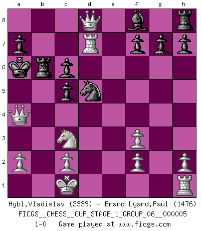 Last move : 1-0 2022 August 8 20:16:49 [Event "FICGS__CHESS__CUP_STAGE_1_GROUP_06__000005"] [Site "FICGS"] [Date "2022.07.16"] [Round "1"] [White "Hybl,Vladislav"] [Black "Brand Lyard,Paul"] [Result "1-0"] [WhiteElo "2339"] [BlackElo "1476"] 1.e4 e5 2.Nf3 Nc6 3.Bb5 d6 4.d4 Bg4 5.Nc3 Bxf3 6.gxf3 exd4 7.Bxc6+ bxc6 8.Qxd4 c5 9.Qd3 Rb8 10.Bf4 Rxb2 11.O-O-O Rb6 12.e5 Qh4 13.Qe4 Ne7 14.exd6 c6 15.d7+ Kd8 16.Bc7+ Kxc7 17.d8Q+ Kb7 18.Rd7+ Ka6 19.Qxh4 Nd5 20.Qa4+ 1-0 Ruy Lopez : Old Steinitz defense Queenside Castling by player White (move 11) Promotion Queen by player White (move 17) Player White won this chess game. Follow this game move after move (download)It was clear to me that the vulnerable point of the American Grandmaster (Bobby Fischer) was in double-edged, hanging, irrational positions, where he often failed to find a win even in a won position. (Efim Geller) Wenn du auf das Glück wartest, wird das Leben ziemlich langweilig. (Mikhail Nekhemyevich Tal) De eso se trata el Ajedrez. Un día le das una lección a tu oponente y al día siguiente el te da una a tí. (Bobby Fischer) Aux échecs, les retours au sommet sont rares : les dommages psychologiques consécutifs à une défaite sont trop sévères. (Daily Telegraph) Chess is everything: art, science and sport. (Anatoly Karpov)