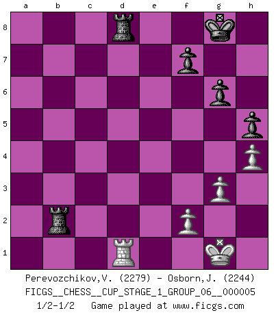 Last move : 1/2-1/2 2022 July 25 21:35:27 [Event "FICGS__CHESS__CUP_STAGE_1_GROUP_06__000005"] [Site "FICGS"] [Date "2022.07.16"] [Round "1"] [White "Perevozchikov,Vjacheslav"] [Black "Osborn,John"] [Result "1/2-1/2"] [WhiteElo "2279"] [BlackElo "2244"] 1.Nf3 d5 2.g3 Nf6 3.Bg2 g6 4.O-O Bg7 5.c4 dxc4 6.Qa4+ Nfd7 7.Qxc4 O-O 8.d4 Nc6 9.Rd1 Nb6 10.Qd3 e5 11.Nxe5 Nxe5 12.dxe5 Qxd3 13.exd3 Bxe5 14.Nc3 c6 15.a4 Be6 16.d4 Bf6 17.a5 Nd5 18.h4 h5 19.Bxd5 cxd5 20.a6 bxa6 21.Rxa6 Rab8 22.Rxa7 Rb4 23.Ra5 Bxd4 24.Nxd5 Bxd5 25.Rxd5 Bxb2 26.Bxb2 Rxb2 27.Rd8 Rxd8 1/2-1/2 Reti : King's Indian attack (Barcza system) Kingside Castling by player White (move 4) Kingside Castling by player Black (move 7) This chess game ended in a draw. Follow this game move after move (download)Capture of the adverse King is the ultimate but not the first object of the game. (William Steinitz) Schach ist ein schwarz-weisser Dschungel. (Garry Kasparov) Tu cuerpo tiene que estar en óptima condición. Tu Ajedrez se deteriora como lo hace tu cuerpo. No puedes separar la mente y el cuerpo. (Bobby Fischer) RxDa4 pat (...) The problem with manipulation is that people can turn on you. (Horatio Caine, C.S.I. Miami)