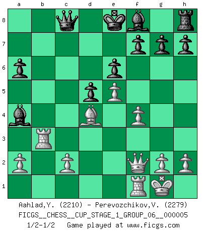 Last move : 1/2-1/2 2022 August 23 13:42:36 [Event "FICGS__CHESS__CUP_STAGE_1_GROUP_06__000005"] [Site "FICGS"] [Date "2022.07.16"] [Round "1"] [White "Aahlad,Yeturu"] [Black "Perevozchikov,Vjacheslav"] [Result "1/2-1/2"] [WhiteElo "2210"] [BlackElo "2279"] 1.e4 e6 2.Nc3 d5 3.d4 Nf6 4.e5 Nfd7 5.f4 c5 6.Nf3 Nc6 7.Be3 cxd4 8.Nxd4 Qb6 9.Qd2 Qxb2 10.Rb1 Qa3 11.Bb5 Nxd4 12.Bxd4 a6 13.Bxd7+ Bxd7 14.Rb3 Qe7 15.Rxb7 Rc8 16.O-O Qd8 17.Qf2 Rxc3 18.Bxc3 Qc8 19.Rb3 Ba4 20.Bd4 1/2-1/2 French defense Kingside Castling by player White (move 16) This chess game ended in a draw. Follow this game move after move (download)A chess genius has died; a loss for humanity. (Viktor Kortchnoi, about Bobby Fischer's death) Ich bin der einzige Schachspieler, der sich während der Vorbereitungen zum Turnier verletzt hat. (Woody Allen) No hay un Gran Maestro de Ajedrez que sea normal; solo se diferencían ellos por la magnitud de su locura. (Viktor Korchnoi) La guerre est enfant de la passion, la passion est enfant du narcissisme et le narcissisme est l'enfant. (...) Une autre partie ? (Thibault de Vassal) Perception is reality. (Immanuel Kant)