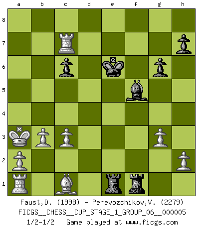 Last move : 1/2-1/2 2022 October 27 8:14:25 [Event "FICGS__CHESS__CUP_STAGE_1_GROUP_06__000005"] [Site "FICGS"] [Date "2022.07.16"] [Round "1"] [White "Faust,Dieter"] [Black "Perevozchikov,Vjacheslav"] [Result "1/2-1/2"] [WhiteElo "1998"] [BlackElo "2279"] 1.c4 e5 2.Nc3 Nf6 3.Nf3 Nc6 4.g3 d5 5.cxd5 Nxd5 6.Bg2 Bc5 7.Nxe5 Nxc3 8.Bxc6+ bxc6 9.dxc3 Qxd1+ 10.Kxd1 Bxf2 11.Rf1 Bc5 12.Rxf7 Bd6 13.Rf3 Bxe5 14.Re3 O-O 15.Rxe5 Rf1+ 16.Kc2 Bf5+ 17.Kb3 Rd8 18.Ka3 R8d1 19.b3 Kf7 20.Kb2 g6 21.Ra5 Rde1 22.Rxa7 Rxe2+ 23.Ka3 R2e1 24.Rxc7+ Ke6 25.Kb2 Re2+ 26.Ka3 R2e1 27.Kb2 Re2+ 28.Ka3 R2e1 1/2-1/2 English Opening Kingside Castling by player Black (move 14) This chess game ended in a draw. Follow this game move after move (download)You need not play well - just help your opponent to play badly. (Genrikh Chepukaitis) Ich habe kein Problem mit Frauen, sondern nur mit dem Niveau ihres Schachspiels (Judith Polgar) Si no le temes a Spassky, entonces elimino el elemento del dinero. (Jim Slater) Donnez-moi un Cavalier en 6e et je gagnerais toutes mes parties. (Steinitz) Never was anything great achieved without danger. (Niccolo Machiavelli)