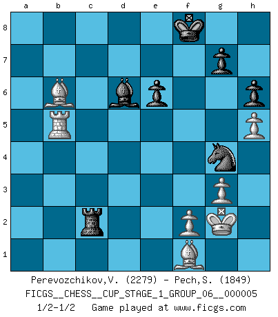 Last move : 1/2-1/2 2022 November 26 17:45:41 [Event "FICGS__CHESS__CUP_STAGE_1_GROUP_06__000005"] [Site "FICGS"] [Date "2022.07.16"] [Round "1"] [White "Perevozchikov,Vjacheslav"] [Black "Pech,Stepan"] [Result "1/2-1/2"] [WhiteElo "2279"] [BlackElo "1849"] 1.Nf3 Nf6 2.g3 d5 3.Bg2 c5 4.O-O Nc6 5.d4 e6 6.c4 dxc4 7.Qa4 Bd7 8.Qxc4 b5 9.Qd3 c4 10.Qc2 Be7 11.e4 O-O 12.Qe2 Qb6 13.Rd1 Rfe8 14.a4 a6 15.axb5 axb5 16.Rxa8 Rxa8 17.d5 Nb4 18.d6 Bd8 19.Ne5 Nc6 20.Be3 Qb7 21.Nxf7 Kxf7 22.e5 Ne8 23.Nc3 Kg8 24.Ne4 Qc8 25.Nc5 Ra5 26.h4 b4 27.Nxd7 Qxd7 28.Bf4 h6 29.h5 c3 30.bxc3 bxc3 31.Qe4 Rc5 32.Rc1 Ba5 33.Bf3 Bb6 34.Kg2 Ba7 35.Bg4 Bb8 36.Kg1 Kf8 37.Qe3 Rc4 38.Qd3 Rc5 39.Qf3 Kg8 40.Qe4 Kf8 41.Qf3 Nd4 42.Qd3 Nc6 43.Qe3 Rc4 44.Be2 Ba7 45.Qd3 Rc5 46.Qe4 Bb8 47.Bd1 Nxd6 48.exd6 Bxd6 49.Be3 Re5 50.Qf4+ Kg8 51.Ba4 Qb7 52.Qf3 Nd8 53.Qxb7 Nxb7 54.Rxc3 Kf8 55.Bc6 Nd8 56.Bf3 Nf7 57.Kg2 Ra5 58.Be2 Ne5 59.Rb3 Ra2 60.Bf1 Rc2 61.Rb5 Ng4 62.Bb6 Rc3 63.Bd4 Rc2 64.Bb6 Rc3 65.Bd4 Rc2 66.Bb6 1/2-1/2 Reti Opening Kingside Castling by player White (move 4) Kingside Castling by player Black (move 11) This chess game ended in a draw. Follow this game move after move (download)Your body has to be in top condition. Your Chess deteriorates as your body does. You can't separate body from mind. (Bobby Fischer) Es ist im Leben wie im Schachspiel. Wir entwerfen einen Plan, dieser bleibt jedoch bedingt durch das, was im Schachspiel dem Gegner, im Leben dem Schicksal zu tun belieben wird. (Arthur Schopenhauer) Tu sabes, camarada Pachman, no disfruto el ser un Ministro, preferería jugar al Ajedrez como tu. (Che Guevara) Lorsque vous vous retrouvez devant une position atroce, ne tendez pas un ultime piège dérisoire avec l'intention d'abandonner si l'adversaire le déjoue ! Faites-vous plutôt un devoir de résister comme si votre vie en dépendait. Jouez le coup qui vous déplairait au centuple si vous étiez dans la peau de votre tortionnaire ! Convictions are more dangerous enemies of truth than lies. (Friedrich Nietzsche)