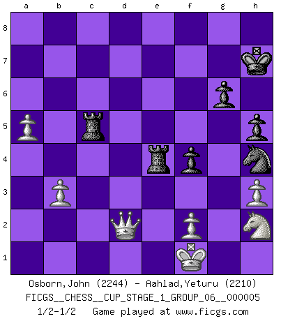 Last move : 1/2-1/2 2022 September 19 6:36:10 [Event "FICGS__CHESS__CUP_STAGE_1_GROUP_06__000005"] [Site "FICGS"] [Date "2022.07.16"] [Round "1"] [White "Osborn,John"] [Black "Aahlad,Yeturu"] [Result "1/2-1/2"] [WhiteElo "2244"] [BlackElo "2210"] 1.e4 e5 2.Nf3 Nc6 3.Bc4 Nf6 4.Ng5 d5 5.exd5 Na5 6.Bb5+ c6 7.dxc6 bxc6 8.Bd3 Nd5 9.Nf3 Bd6 10.O-O Nf4 11.Re1 Nxd3 12.cxd3 O-O 13.Nc3 c5 14.b3 Nc6 15.Ba3 Bg4 16.h3 Bh5 17.Rc1 f5 18.Nb5 Be7 19.Bxc5 Bxc5 20.Rxc5 Nb4 21.R1xe5 Nxd3 22.Rcd5 Nxe5 23.Rxd8 Raxd8 24.d4 a6 25.Nc3 Bxf3 26.gxf3 Rxd4 27.Qe2 Re8 28.Kg2 h6 29.f4 Rxf4 30.Qxa6 Kh7 31.Nd5 Re4 32.Qd6 Ng6 33.Qd7 Kh8 34.a4 R8e5 35.Qd8+ Kh7 36.Ne3 f4 37.Ng4 Re7 38.Qd1 h5 39.Nh2 Nh4+ 40.Kf1 g6 41.a5 R4e5 42.Qd2 Rc5 43.Kg1 Re4 44.Kf1 Re7 45.Kg1 Re4 46.Kf1 1/2-1/2 Two knights defense Kingside Castling by player White (move 10) Kingside Castling by player Black (move 12) This chess game ended in a draw. Follow this game move after move (download)In Fischer's hands, a slight theoretical advantage is as good a being a Queen ahead. (Isaac Kashdan) Ich kenne keine einzige Person, die behaupten würde, Garri Kasparow sei ein guter Mensch (Nigel Short) Los errores estan ahí, esperando a que se cometan. (Savielly Tartakower) Il vaut toujours mieux jouer un plan faux de façon logique que de n'avoir pas de plan du tout. (Victor Kortchnoï) There is a computer disease that anybody who works with computers knows about. It's a very serious disease and it interferes completely with the work. The trouble with computers is that you 'play' with them ! (Richard P. Feynman)