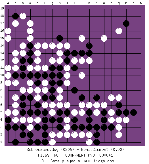 Last move : 1-0 2008 February 8 0:49:26 [Event "FICGS__GO__TOURNAMENT_KYU__000041"] [Site "FICGS"] [Date "2007.08.03"] [Round "1"] [Black "Sobrecases,Guy"] [White "Beni,Clement"] [Result "1-0"] [Rating 1 "0206"] [Rating 2 "0700"] 1.r17 d3 2.c3 c4 3.c2 e4 4.d2 e2 5.d1 g1 6.b3 b4 7.b1 d17 8.a4 a5 9.a3 b6 10.c6 c8 11.c7 e7 12.c5 b5 13.d5 b7 14.e6 f6 15.d7 d8 16.f7 e8 17.f5 g6 18.e5 g5 19.f4 d4 20.f3 h2 21.g4 j4 22.f2 g2 23.e3 b9 24.g7 h7 25.g8 h8 26.g9 f11 27.h9 j9 28.h10 h12 29.g11 j10 30.f10 e11 31.e10 g12 32.h11 j11 33.d10 d11 34.e9 f8 35.c10 b11 36.b10 a10 37.c11 b12 38.c12 c13 39.d13 e13 40.d12 c14 41.d14 e14 42.f12 e12 43.f13 f14 44.g13 h13 45.c15 d15 46.b14 b13 47.b15 d16 48.h4 j6 49.h5 h6 50.f1 j3 51.j5 k5 52.e1 g14 53.a13 a11 54.a14 f9 55.g10 q16 56.a12 a9 57.c16 b17 58.c17 c18 59.b16 a16 60.k4 l5 61.k3 k2 62.h3 j2 63.l3 l2 64.m3 m2 65.n3 n5 66.b18 a15 67.n2 q3 68.n1 m1 69.o3 p4 70.p3 q2 71.o4 p5 72.o5 p7 73.m5 m6 74.m4 o6 75.n7 n6 76.l7 l6 77.j12 k12 78.j13 j14 79.k13 l12 80.l13 l15 81.m13 m12 82.m14 o15 83.h15 h14 84.k11 l10 85.k8 d9 86.q5 q4 87.q6 q7 88.r5 r4 89.s5 1-0 This go game has been lost on time (started : 2007.08.03 11:16:18) Here are the names of the openings (joseki) played in the four corners : Corner d4 : d3 c3 Komoku (Somok, Xiao~mu`) 3-4 Point. The komoku (3-4) point is the traditional corner enclosure move.. This is not joseki. n invasion to take the corner after White made a shimari-less moyo on top disabling the other moves. Corner q16 : r17 q16 San-San (Sam-Sam, San-San) 3-3 Point. The San-San (3-3) point, emphasizing territory at the expense of influence. Kata-tsuki (shoulder hit). The shoulder-hit is the traditional answer to the 3-3. The direction of Black 3 depends on the positions on the side. Crawling once may be the premise for a follow-up move of sliding with a knight's move in the opposite direction. If Black plays 3 at 3-4 (to the right), the follow-on knight's move is then played at the top (e.g. 3-4, 4-5, 5-2). Black's knight's move reduces territory potential on the side it is played. Corner q4 : l5 l3 This joseki is unknown. A weak or weird move has probably been played in this corner. Player Black won this Go (weiqi, baduk) game. Follow this game move after move (download)There is death in the hane. (Anonymous) Fortune favours the audacious. (Desiderius Erasmus)