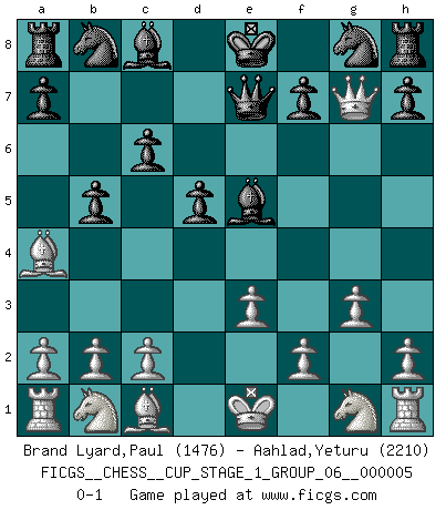 Last move : 0-1 2022 July 20 21:2:53 [Event "FICGS__CHESS__CUP_STAGE_1_GROUP_06__000005"] [Site "FICGS"] [Date "2022.07.16"] [Round "1"] [White "Brand Lyard,Paul"] [Black "Aahlad,Yeturu"] [Result "0-1"] [WhiteElo "1476"] [BlackElo "2210"] 1.Nh3 d5 2.Ng1 e5 3.e3 Bd6 4.Bb5+ c6 5.Ba4 Qg5 6.g3 Qe7 7.d4 exd4 8.Qxd4 b5 9.Qxg7 Be5 0-1 Amar (Paris) Opening Player Black won this chess game. Follow this game move after move (download)I like the moment when I break a man's ego. (Bobby Fischer) Im Internet Chess Club betrug mein Rating vorübergehend 3350 ELO-Punkte. (Sergej Karjakin) Alguna parte de un error es siempre correcto. (Savielly Tartakover) J'apprécie les joueurs d'est-indienne, c'est grâce à eux que je nourris ma famille depuis tant d'années. (Petrosian) No, I am still playing. (Anatoly Karpov)