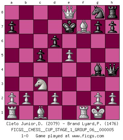 Last move : 1-0 2022 July 27 23:48:39 [Event "FICGS__CHESS__CUP_STAGE_1_GROUP_06__000005"] [Site "FICGS"] [Date "2022.07.16"] [Round "1"] [White "Cleto Junior,Dirceu"] [Black "Brand Lyard,Paul"] [Result "1-0"] [WhiteElo "2079"] [BlackElo "1476"] 1.e4 e5 2.Nf3 Nc6 3.Bb5 Nd4 4.Nxd4 exd4 5.O-O c6 6.Bc4 c5 7.c3 dxc3 8.Nxc3 Bd6 9.e5 Bxe5 10.Qe2 d6 11.f4 Qh4 12.fxe5 Bg4 13.Bxf7+ Kd7 14.Qb5+ Ke7 15.Qxb7+ Kf8 16.Qxa8+ Ke7 17.Qe8+ 1-0 Ruy Lopez : Bird's defense Kingside Castling by player White (move 5) Player White won this chess game. Follow this game move after move (download)One doesn't have to play well, it's enough to play better than your opponent. (Siegbert Tarrasch) Kostenjuk hat keinen Sexappeal. (Loek van Wely) Puntos débiles o agujeros en la posición de tu oponente deben de ser ocupados por piezas, no Peones. (Siegbert Tarrasch) La conception d'un plan est le processus par lequel un joueur exploite les avantages de sa position tout en s'efforçant d'en réduire au minimum les inconvénients. Afin de garantir le succès, un plan doit toujours se fonder sur un diagnostic objectif des particularités d'une position. La conception d'un plan est d'autant plus difficile que la position est équilibrée, et grandement facilitée lorsqu'il n'existe qu'un seul plan susceptible de répondre aux exigences de la position. (Harry Golombek) A computer lets you make more mistakes faster than any invention in human history - with the possible exceptions of handguns and tequila. (Mitch Ratcliffe)