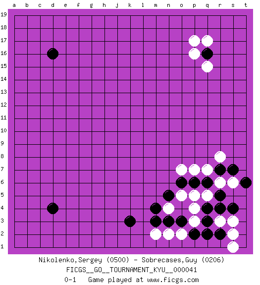 Last move : 0-1 2007 October 22 1:46:30 [Event "FICGS__GO__TOURNAMENT_KYU__000041"] [Site "FICGS"] [Date "2007.08.03"] [Round "1"] [Black "Nikolenko,Sergey"] [White "Sobrecases,Guy"] [Result "0-1"] [Rating 1 "0500"] [Rating 2 "0206"] 1.q16 p17 2.d16 q17 3.d4 p16 4.q3 q15 5.r5 q5 6.q4 p5 7.k3 p4 8.o3 p3 9.p2 r3 10.r2 s3 11.r4 s2 12.s4 s1 13.q2 n2 14.n3 m2 15.m3 o2 16.q6 r6 17.r7 s6 18.s7 q7 19.p6 p7 20.o6 o5 21.n5 r8 22.t6 n4 23.m4 o7 0-1 This go game has been lost on time (started : 2007.08.03 11:16:18) Here are the names of the openings (joseki) played in the four corners : Corner q16 : q16 p17 Hoshi (Hwajeom, Seongjeom, Xingwei`) 4-4 Point. The star or hoshi (4-4) point, emphasizing influence at the potential expense of territory. Player White won this Go (weiqi, baduk) game. Follow this game move after move (download)Do not make moves that strengthen your opponent ! (Anonymous) Is not life a hundred times too short to bore ourselves ? (Friedrich Nietzsche)