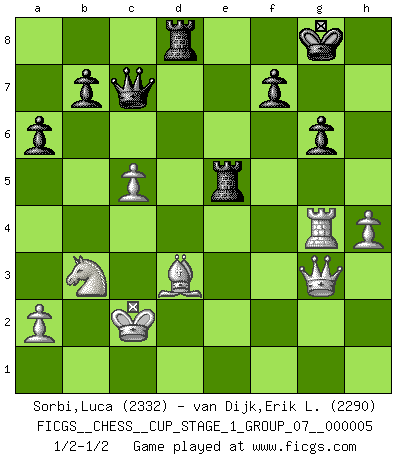 Last move : 1/2-1/2 2022 November 17 3:28:43 [Event "FICGS__CHESS__CUP_STAGE_1_GROUP_07__000005"] [Site "FICGS"] [Date "2022.07.16"] [Round "1"] [White "Sorbi,Luca"] [Black "van Dijk,Erik L."] [Result "1/2-1/2"] [WhiteElo "2332"] [BlackElo "2290"] 1.e4 c5 2.Nf3 d6 3.d4 cxd4 4.Nxd4 Nf6 5.Nc3 a6 6.Be3 e5 7.Nb3 Be6 8.f3 h5 9.Qd2 Nbd7 10.Nd5 Bxd5 11.exd5 g6 12.O-O-O Nb6 13.Kb1 Nbxd5 14.Bg5 Be7 15.Bd3 Qc7 16.Rhe1 Nb6 17.Qf2 O-O 18.h4 Nfd5 19.Bh6 Na4 20.c4 Nac3+ 21.bxc3 Nxc3+ 22.Kc2 Nxd1 23.Kxd1 Rfd8 24.g4 d5 25.c5 e4 26.Qd4 Bf8 27.Bxf8 Rxf8 28.fxe4 dxe4 29.Rxe4 Rad8 30.Qe3 hxg4 31.Rxg4 Rfe8 32.Qg3 Re5 33.Kc2 1/2-1/2 Sicilian : Najdorf, Byrne (English) attack Queenside Castling by player White (move 12) Kingside Castling by player Black (move 17) This chess game ended in a draw. Follow this game move after move (download)A good sacrifice is one that is not necessarily sound but leaves your opponent dazed and confused. (Rudolph Spielmann) Wir irren allesamt, nur jeder irrt anders. (Georg Christoph Lichtenberg) Hay jugadores fuertes y personas amables y yo soy un jugador fuerte. (Bobby Fischer) La guerre est enfant de la passion, la passion est enfant du narcissisme et le narcissisme est l'enfant. (...) Une autre partie ? (Thibault de Vassal) War is the child of passion, passion is the child of narcissism and narcissism is the child. (...) Another game ? (Thibault de Vassal)