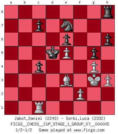 Last move : 1/2-1/2 2022 November 13 14:31:56 [Event "FICGS__CHESS__CUP_STAGE_1_GROUP_07__000005"] [Site "FICGS"] [Date "2022.07.16"] [Round "1"] [White "Jabot,Daniel"] [Black "Sorbi,Luca"] [Result "1/2-1/2"] [WhiteElo "2243"] [BlackElo "2332"] 1.e4 e5 2.Nf3 Nc6 3.Bb5 Nf6 4.O-O Nxe4 5.d4 Nd6 6.Bxc6 dxc6 7.dxe5 Nf5 8.Qxd8+ Kxd8 9.Nc3 Bd7 10.h3 h6 11.b3 Kc8 12.Bb2 b6 13.Rad1 c5 14.Rfe1 Be6 15.Nd5 g5 16.c4 Kb7 17.Kh2 Ne7 18.g4 b5 19.Kg3 bxc4 20.bxc4 Kc6 21.Ne3 Ng6 22.Bc3 a5 23.a4 Rb8 24.Bxa5 Ra8 25.Bd2 Rxa4 26.Ra1 Rxa1 27.Rxa1 Be7 28.Nf5 Bxc4 29.Rc1 Be6 30.Nxe7+ Nxe7 31.Nd4+ Kd5 32.Nxe6 fxe6 33.Be3 c4 1/2-1/2 Ruy Lopez : Berlin defense, Open variation Kingside Castling by player White (move 4) This chess game ended in a draw. Follow this game move after move (download)You must take your opponent into a deep dark forest where 2+2=5, and the path leading out is only wide enough for one. (Mikhail Tal) Schach ist das schnellste Spiel der Welt, weil man in jeder Sekunde Tausende von Gedanken ordnen muß. (Albert Einstein) El Ajedrez es tortura mental. (Garry Kasparov) La vie et les Echecs sont tous les deux une lutte constante. (Lasker) I think your argument is specious - I think your tie is ugly. (Gregory House to Dr. Foreman, House M.D.)