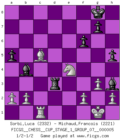 Last move : 1/2-1/2 2022 October 8 11:32:19 [Event "FICGS__CHESS__CUP_STAGE_1_GROUP_07__000005"] [Site "FICGS"] [Date "2022.07.16"] [Round "1"] [White "Sorbi,Luca"] [Black "Michaud,Francois"] [Result "1/2-1/2"] [WhiteElo "2332"] [BlackElo "2221"] 1.e4 e5 2.Nf3 Nc6 3.Bb5 a6 4.Ba4 Be7 5.O-O Nf6 6.Re1 b5 7.Bb3 O-O 8.c3 d5 9.exd5 Nxd5 10.Nxe5 Nxe5 11.Rxe5 c6 12.Re1 Bd6 13.d3 Bf5 14.Qf3 Qh4 15.g3 Qh3 16.Be3 Bxd3 17.Nd2 Bf5 18.Bxd5 cxd5 19.Qxd5 Rfd8 20.Qg2 b4 21.Qxh3 Bxh3 22.Ne4 bxc3 23.Nxc3 h5 24.Rad1 Bb4 25.Rxd8+ Rxd8 26.Rc1 Rd3 27.Ne4 f6 28.Bc5 a5 1/2-1/2 Ruy Lopez Kingside Castling by player White (move 5) Kingside Castling by player Black (move 7) This chess game ended in a draw. Follow this game move after move (download)Via the squares on the chessboard, the Indians explain the movement of time and the age, the higher influences which control the world and the ties which link Chess with the human soul. (Al-Masudi) Ein Großmeister muß tausende Partien in seinem Kopf speichern, denn diese sind für Ihn, was die Worte der Muttersprache für gewöhnliche Leute sind, oder Noten für Musiker... (Garry Kasparov) Aún el Rey más flojo huye despavorido ante la amenaza de un Jaque doble. (Aaron Nimzowitsch) Les Echecs représentent une sphère d'idées créatrices basée sur la volonté des deux protagonistes. (Smyslov) Any activity becomes creative when the doer cares about doing it right or doing it better. (John Updike)