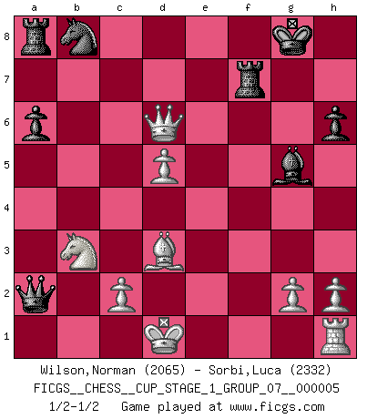 Last move : 1/2-1/2 2022 August 30 9:37:29 [Event "FICGS__CHESS__CUP_STAGE_1_GROUP_07__000005"] [Site "FICGS"] [Date "2022.07.16"] [Round "1"] [White "Wilson,Norman"] [Black "Sorbi,Luca"] [Result "1/2-1/2"] [WhiteElo "2065"] [BlackElo "2332"] 1.e4 c5 2.Nf3 d6 3.d4 cxd4 4.Nxd4 Nf6 5.Nc3 a6 6.Bg5 e6 7.f4 Qb6 8.Qd3 Qxb2 9.Rb1 Qa3 10.f5 Be7 11.fxe6 Bxe6 12.Rxb7 Qc5 13.Nd5 Bxd5 14.exd5 h6 15.Qe3 Qa5+ 16.Kd1 O-O 17.Bxf6 Bxf6 18.Qe4 Bg5 19.Nb3 Qxa2 20.Bd3 g6 21.Rxf7 Rxf7 22.Qxg6+ Kf8 23.Qxd6+ Kg8 1/2-1/2 Sicilian : Najdorf, 7...Qb6 Kingside Castling by player Black (move 16) This chess game ended in a draw. Follow this game move after move (download)One doesn't have to play well, it's enough to play better than your opponent. (Siegbert Tarrasch) Das Schach ist nichts für kleine Geister, es beansprucht einen vollen Mann, der sich nicht sklavisch an das Überlieferte hält, sondern selbständig die Tiefen des Spiels zu ergründen sucht. (Wilhelm Steinitz) A la fecha, Fischer esta simplemente un nivel arriba de todos los mejores jugadores de Ajedrez del mundo. (John Jacobs) Les Cavaliers se révèlent fort utiles dans les positions fermées. D'habitude, les Fous sont un peu plus forts que les Cavaliers dans les positions ouvertes. Qu'on le veuille ou non, il restera toujours des exceptions ! Remember : Your focus determines your reality. (Qui-Gon Jinn in Star Wars ep.1)