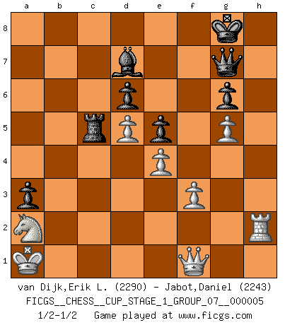 Last move : 1/2-1/2 2022 December 14 11:25:9 [Event "FICGS__CHESS__CUP_STAGE_1_GROUP_07__000005"] [Site "FICGS"] [Date "2022.07.16"] [Round "1"] [White "van Dijk,Erik L."] [Black "Jabot,Daniel"] [Result "1/2-1/2"] [WhiteElo "2290"] [BlackElo "2243"] 1.d4 Nf6 2.c4 g6 3.Nc3 Bg7 4.e4 O-O 5.f3 d6 6.Be3 e5 7.d5 c6 8.Qd2 cxd5 9.cxd5 Nbd7 10.Nge2 a6 11.g4 h5 12.h3 b5 13.Nc1 Nb6 14.a3 Bd7 15.N1a2 Rc8 16.b3 Be8 17.Rb1 Nbd7 18.Kd1 Nh7 19.gxh5 Qh4 20.hxg6 fxg6 21.Be2 Nhf6 22.Bg5 Qh7 23.h4 Nh5 24.Kc1 Ng3 25.Rg1 Nxe2+ 26.Qxe2 Qh5 27.Rg3 Bh6 28.Kb2 Bxg5 29.hxg5 Nc5 30.Rbg1 Bd7 31.Qe3 a5 32.b4 axb4 33.axb4 Na4+ 34.Nxa4 bxa4 35.Qd3 a3+ 36.Ka1 Rf7 37.b5 Rc5 38.Nc3 Rf8 39.b6 Rb8 40.Qf1 Qh8 41.Rh1 Qg7 42.Na2 Rxb6 43.Rg2 Rb2 44.Rgh2 Rxh2 45.Rxh2 Bb5 46.Qh3 Bd7 47.Qf1 1/2-1/2 King's Indian : 4.e4 Kingside Castling by player Black (move 4) This chess game ended in a draw. Follow this game move after move (download)After black's reply to 1.e4 with 1..e5, leaves him always trying to get into the game. (Howard Staunton) Jeder leidlich begabte Spieler, er braucht keineswegs hervorragend veranlagt zu sein, kann es zum Meister bringen. Aber das ist ja auch gar nicht nötig! Der richtige Standpunkt ist es, zu seinem Vergnügen zu spielen, und man glaube ja nicht, dass der Genuss proportional dem Können sei. (Siegbert Tarrasch) ¿Que sería del Ajedrez sin errores graciosos?. (Kurt Richter) A chaque perte on perd un peu de soi. (Joël Lautier) To err is human, to shift the blame on someone else is tactical. (Mladen Jankovic)