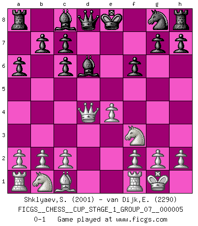 Last move : 0-1 2022 September 2 9:5:8 [Event "FICGS__CHESS__CUP_STAGE_1_GROUP_07__000005"] [Site "FICGS"] [Date "2022.07.16"] [Round "1"] [White "Shklyaev,Sergei"] [Black "van Dijk,Erik L."] [Result "0-1"] [WhiteElo "2001"] [BlackElo "2290"] 1.e4 e5 2.Nf3 Nc6 3.Bb5 a6 4.Bxc6 dxc6 5.O-O Bd6 6.d4 exd4 7.Qxd4 f6 0-1 This chess game has been lost on time (started : 2022.07.16 1:8:6) Ruy Lopez : Exchange variation, 5.O-O Kingside Castling by player White (move 5) Player Black won this chess game. Follow this game move after move (download)In Chess, as it is played by masters, chance is practically eliminated. (Emanuel Lasker) Privat ist Kortschnoi kein schlechter Mensch, sehr sympathisch. Aber während des Spiels ist er grausam. Er will dich töten. (Miguel Najdorf) Preferería tener un Peón que un dedo. (Reuben Fine) Vous savez, camarade Pachman, je n'éprouve pas de plaisir à être ministre, je jouerais plutôt aux échecs comme vous, ou alors ferais une révolution au Venezuela. (Che Guevara à Ludek Pachman, 'Checkmate in Prague', 1975) He is a liar. I just don't know what the lie is yet. (Horatio Caine, C.S.I. Miami)