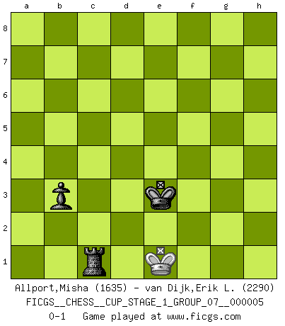 Last move : 0-1 2022 December 21 3:19:32 [Event "FICGS__CHESS__CUP_STAGE_1_GROUP_07__000005"] [Site "FICGS"] [Date "2022.07.16"] [Round "1"] [White "Allport,Misha"] [Black "van Dijk,Erik L."] [Result "0-1"] [WhiteElo "1635"] [BlackElo "2290"] 1.e4 e6 2.Nc3 d5 3.d4 Nf6 4.a3 Nxe4 5.Nxe4 dxe4 6.Be3 Nd7 7.Ne2 Bd6 8.Nc3 f5 9.Bc4 Qe7 10.Qh5+ Qf7 11.Qxf7+ Kxf7 12.Nb5 Nf6 13.Nxd6+ cxd6 14.b3 Bd7 15.Be2 e5 16.g3 h6 17.dxe5 dxe5 18.Rd1 Rhc8 19.c4 g5 20.Bc1 f4 21.gxf4 gxf4 22.Bb2 f3 23.Bf1 e3 24.fxe3 Rg8 25.e4 Rad8 26.Kf2 Ng4+ 27.Kxf3 Rdf8 28.Ke2 Ke8 29.Kd2 Nf2 30.Be2 Nxd1 31.Bxd1 Rg2+ 32.Kc1 Bg4 33.Bxe5 Bxd1 34.Rxd1 Rf3 35.Rd6 h5 36.b4 Rxa3 37.Rd2 Rxd2 38.Kxd2 Kd7 39.Bb2 Rh3 40.Be5 a6 41.Kc2 Re3 42.Bg3 Rxe4 43.Kd3 Rg4 44.Kc3 h4 45.Bf2 b5 46.cxb5 axb5 47.Be1 h3 48.Bd2 Ke6 49.Be3 Kd5 50.Bb6 Rg3+ 51.Kd2 Rg2+ 52.Kd3 Rxh2 53.Bc7 Rb2 54.Bb8 h2 55.Bxh2 Rxh2 56.Ke3 Rh4 57.Kd3 Rxb4 58.Ke3 Rc4 59.Kd3 b4 60.Kd2 Ke4 61.Ke2 Rc2+ 62.Ke1 b3 63.Kd1 Ke3 64.Ke1 Rc1+ 0-1 French defense 10 pieces endgame at move 42 : White KBPPP , Black KRPPP WHITE : King + 1 Bishop 3 Pawns BLACK : King + 1 Rook 3 Pawns 9 pieces endgame at move 46 : White KBPPP , Black KRPP WHITE : King + 1 Bishop 3 Pawns BLACK : King + 1 Rook 2 Pawns 8 pieces endgame at move 46 : White KBPP , Black KRPP WHITE : King + 1 Bishop 2 Pawns BLACK : King + 1 Rook 2 Pawns 7 pieces endgame at move 52 : White KBP , Black KRPP WHITE : King + 1 Bishop 1 Pawn BLACK : King + 1 Rook 2 Pawns 6 pieces endgame at move 55 : White KBP , Black KRP WHITE : King + 1 Bishop 1 Pawn BLACK : King + 1 Rook 1 Pawn 5 pieces endgame at move 55 : White KP , Black KRP WHITE : King + 1 Pawn BLACK : King + 1 Rook 1 Pawn 4 pieces endgame at move 57 : White K , Black KRP WHITE : King + BLACK : King + 1 Rook 1 Pawn Player Black won this chess game. Follow this game move after move (download)Blessed be the memory of him who gave the world this immortal game. (A. G. Gardiner) Ich habe kein Problem mit Frauen, sondern nur mit dem Niveau ihres Schachspiels (Judith Polgar) Creo que una cierta cantidad de temperamento es esperada de los genios del Ajedrez. (Ron Gross) Fischer est le meilleur joueur du monde et Karpov n'est qu'un joueur de bistrot. (Garry Kasparov, agé de 16 ans) Train yourself to let go of everything you fear to lose. (Master Yoda in Star Wars ep.3)