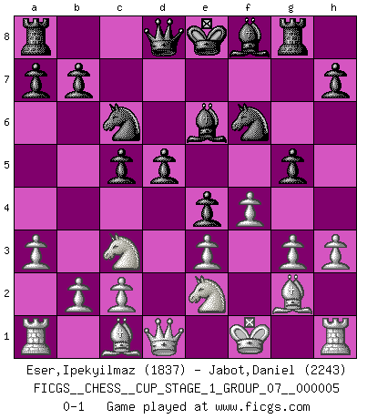 Last move : 0-1 2022 October 7 2:15:41 [Event "FICGS__CHESS__CUP_STAGE_1_GROUP_07__000005"] [Site "FICGS"] [Date "2022.07.16"] [Round "1"] [White "Eser,Ipekyilmaz"] [Black "Jabot,Daniel"] [Result "0-1"] [WhiteElo "1837"] [BlackElo "2243"] 1.a3 d5 2.g3 e5 3.Bg2 c6 4.Kf1 Be6 5.d3 f5 6.f3 Nf6 7.f4 e4 8.Nc3 c5 9.e3 Nc6 10.dxe4 fxe4 11.h3 Rg8 12.Nge2 g5 0-1 This chess game has been lost on time (started : 2022.07.16 1:8:6) Anderssen's Opening Player Black won this chess game. Follow this game move after move (download)For surely of all the drugs in the world, Chess must be the most permanently pleasurable. (Assiac) Ein Schachspiel besteht aus drei Phasen: Die erste, wenn du hofftst den Vorteil zu haben, die zweite, wenn du glaubst einen Vorteil zu haben, und die dritte.... wenn du weißt Du wirst verlieren. (Savielly Grigorievitsch Tartakower) a manera como él juega al Ajedrez, demuestra la completa naturaleza de un hombre. (Stanley Ellin) On peut tirer plus d'utilité d'une partie perdue que de 100 parties gagnées. (Capablanca) In God we trust, all others we virus scan. (Anonymous)