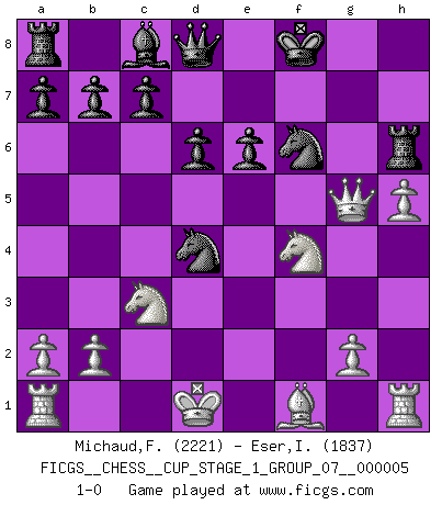 Last move : 1-0 2022 September 29 18:57:36 [Event "FICGS__CHESS__CUP_STAGE_1_GROUP_07__000005"] [Site "FICGS"] [Date "2022.07.16"] [Round "1"] [White "Michaud,Francois"] [Black "Eser,Ipekyilmaz"] [Result "1-0"] [WhiteElo "2221"] [BlackElo "1837"] 1.e4 e6 2.d4 g6 3.Nc3 Bg7 4.h4 h6 5.h5 g5 6.f4 Kf8 7.fxg5 hxg5 8.Nh3 Bh6 9.Qg4 f6 10.e5 d6 11.exf6 Nxf6 12.Qg3 Nc6 13.Bxg5 Nxd4 14.Nf4 Nxc2+ 15.Kd1 Nd4 16.Bxh6+ Rxh6 17.Qg5 1-0 This chess game has been lost on time (started : 2022.07.16 1:8:6) French defense Player White won this chess game. Follow this game move after move (download)Fischer is completely natural. He plays no roles. He's like a child. Very, very simple. (Zita Rajcsanyi) Schach ist eine Sache der genauen Beurteilung, wann man zuschlagen und wann man sich ducken muss. (Robert James Fischer) Una partida de Ajedrez se divide en 3 etapas: la primera cuando piensas que tienes la ventaja, la segunda cuando crees que tienes la ventaja y la tercera... ¡cuando te das cuenta que vas a perder!. (Savielly Tartakower) Karpov est une pièce de musée. (Garry Kasparov) Life is like internet, nothing interesting, but noone want to leave it. (Ilmars Cirulis)