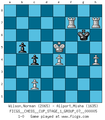 Last move : 1-0 2022 November 5 10:57:38 [Event "FICGS__CHESS__CUP_STAGE_1_GROUP_07__000005"] [Site "FICGS"] [Date "2022.07.16"] [Round "1"] [White "Wilson,Norman"] [Black "Allport,Misha"] [Result "1-0"] [WhiteElo "2065"] [BlackElo "1635"] 1.e4 e5 2.Nf3 d6 3.d4 Nd7 4.Bc4 h6 5.dxe5 dxe5 6.Bxf7+ Kxf7 7.Nxe5+ Kf6 8.Nc3 Bb4 9.Qd4 Bxc3+ 10.bxc3 Qe8 11.Nxd7+ Kg6 12.Ne5+ Kh7 13.Bb2 Ne7 14.c4 Rg8 15.f4 Nc6 16.Nxc6 Qxc6 17.O-O Be6 18.c5 Rad8 19.Qe3 Bc4 20.Rf3 b6 21.h3 Qxc5 22.Qxc5 bxc5 23.Be5 Bb5 24.Rc3 c4 25.Rb1 a6 26.Ra1 c6 27.a4 Ra8 28.Rca3 Rae8 29.axb5 axb5 30.Ra7 Rxe5 31.fxe5 Re8 32.Rc7 Rxe5 33.R1a7 Kg6 34.Rxc6+ Kh7 35.R6c7 Rg5 36.Kf2 Rg6 37.Rab7 Rf6+ 38.Ke3 Rg6 39.g4 h5 40.gxh5 Rg3+ 41.Kf4 Rg1 42.h4 Kh6 43.Rb8 Rf1+ 44.Ke5 Kxh5 45.Rxg7 Kh6 46.R8b7 Kh5 47.Rg8 Kh6 48.Rh8+ Kg6 49.R8h7 Rf7 50.Rbxf7 1-0 This chess game has been lost on time (started : 2022.07.16 1:8:6) Philidor : Hanham variation Kingside Castling by player White (move 17) 10 pieces endgame at move 45 : White KRRPPP , Black KRPP WHITE : King + 2 Rooks 3 Pawns BLACK : King + 1 Rook 2 Pawns 9 pieces endgame at move 50 : White KRRPPP , Black KPP WHITE : King + 2 Rooks 3 Pawns BLACK : King + 2 Pawns Player White won this chess game. Follow this game move after move (download)When you play Bobby, it is not a question if you win or lose. It is a question if you survive. (Boris Spassky) Wenn Capablanka heute auf der Schachbühne erscheinen würde, hätte er ein halbes Jahr gebraucht um sich die Schachtheorie anzueignen. Und dann hätte er alles und jeden besiegt. (Mikhail Moiseyevich Botvinik) En el Ajedrez, cuando menos, el valiente hereda la tierra. (Edmar Mednis) Psychologiquement, tu dois avoir confiance en toi même, mais cette confiance doit être basée sur des faits. (Robert Fischer) What doesn't kill us makes us stronger. (Friedrich Nietzsche)