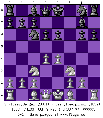 Last move : 0-1 2022 September 2 23:52:50 [Event "FICGS__CHESS__CUP_STAGE_1_GROUP_07__000005"] [Site "FICGS"] [Date "2022.07.16"] [Round "1"] [White "Shklyaev,Sergei"] [Black "Eser,Ipekyilmaz"] [Result "0-1"] [WhiteElo "2001"] [BlackElo "1837"] 1.e4 e6 2.d4 g6 3.h4 Bg7 4.h5 h6 5.hxg6 fxg6 6.Nc3 Nc6 7.Nf3 d6 0-1 This chess game has been lost on time (started : 2022.07.16 1:8:6) French defense Player Black won this chess game. Follow this game move after move (download)You have to have the fighting spirit. You have to force moves and take chances. (Bobby Fischer) Wie kann ich Remis annehmen? Ich weiß ja gar nicht, wie ich stehe! (Fritz Sämisch) No nos podemos resistir a la fascinación de un sacrificio ya que la pasión por los sacrificios es parte de la naturaleza de un jugador de Ajedrez. (Rudolf Spielman) Même si l'adversaire joue le coup analysé précédemment, recommencez l'analyse en voyant la nouvelle position. Première règle de Blumenfeld Some people are so afraid to die that they never begin to live. (Henry Van Dyke)