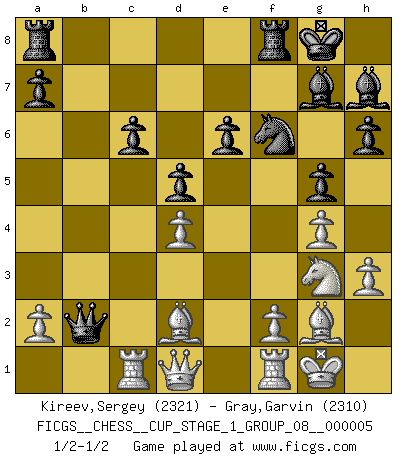 Last move : 1/2-1/2 2022 August 10 9:12:44 [Event "FICGS__CHESS__CUP_STAGE_1_GROUP_08__000005"] [Site "FICGS"] [Date "2022.07.16"] [Round "1"] [White "Kireev,Sergey"] [Black "Gray,Garvin"] [Result "1/2-1/2"] [WhiteElo "2321"] [BlackElo "2310"] 1.d4 Nf6 2.Bf4 g6 3.Nd2 Bg7 4.e4 d5 5.e5 Nfd7 6.c3 c5 7.g3 cxd4 8.cxd4 Nc6 9.Ne2 f6 10.exf6 Nxf6 11.Bg2 O-O 12.O-O Bf5 13.Rc1 h6 14.Be3 g5 15.Nf3 Ng4 16.Bd2 e6 17.h3 Nf6 18.Ne5 Qb6 19.g4 Bh7 20.Nxc6 bxc6 21.Ng3 Qxb2 1/2-1/2 Queen's pawn game Kingside Castling by player Black (move 11) Kingside Castling by player White (move 12) This chess game ended in a draw. Follow this game move after move (download)The older I grow, the more I value Pawns. (Keres) Wenn ich einen Club besuche, sind die Spieler stumm vor Staunen. (José Raúl Capablanca) El Ajedrez es una hermosa aventura. (Bent Larsen) En blitz, le Cavalier l'emporte sur le Fou. (Vlastimil Hort) CHESS, n. f. [echecs, Fr.] A nice and abstruse game, in which two sets of puppets are moved in opposition to each other. (Dr Samuel Johnson, A Dictionary Of The English Language, 1755)