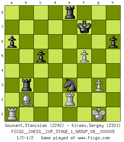 Last move : 1/2-1/2 2022 August 3 23:48:38 [Event "FICGS__CHESS__CUP_STAGE_1_GROUP_08__000005"] [Site "FICGS"] [Date "2022.07.16"] [Round "1"] [White "Gounant,Stanislas"] [Black "Kireev,Sergey"] [Result "1/2-1/2"] [WhiteElo "2242"] [BlackElo "2321"] 1.d4 Nf6 2.c4 e6 3.g3 c5 4.d5 exd5 5.cxd5 d6 6.Nc3 g6 7.Bg2 Bg7 8.Nf3 O-O 9.O-O Re8 10.Bf4 Bf5 11.Nh4 Bc8 12.Qc1 a6 13.a4 Qc7 14.Bh6 Bh8 15.Nf3 Nbd7 16.Nd2 Rb8 17.a5 Ng4 18.Bf4 b5 19.axb6 Nxb6 20.Nde4 Ne5 21.Qc2 Qe7 22.b3 Bg7 23.Bg5 f6 24.Bc1 h6 25.f4 Ng4 26.h3 f5 27.Nxd6 Bd4+ 28.Kh1 Qxd6 29.hxg4 Bb7 30.e3 Bxc3 31.Qxc3 Nxd5 32.Qc4 Qe6 33.gxf5 gxf5 34.e4 fxe4 35.f5 Qf7 36.Kg1 e3 37.Bb2 e2 38.Rfe1 Ne3 39.Qxf7+ Kxf7 40.Bxb7 Rxb7 41.Rxe2 Rxb3 1/2-1/2 Catalan Opening Kingside Castling by player Black (move 8) Kingside Castling by player White (move 9) This chess game ended in a draw. Follow this game move after move (download)When you are lonely, when you feel yourself an alien in the world, play Chess. This will raise your spirits and be your counselor in war. (Aristotle) Was ist der Unterschied zwischen einem Strassenarbeiter und einem Schachspieler? --Der Schachspieler bewegt sich ab und zu. (Anonymous) El Ajedrez por encima de todo... ¡es una pelea!. (Emanuel Lasker) Je ne suis pas le dernier à jouer lâchement des coups douteux pendant le zeïtnot de l'adversaire pour l'achever: en effet les coups qui font le plus peur sont ceux que l'on ne comprend pas. Je me fais souvent peur quand je joue. (Un professeur anonyme) A shortcut is the longest distance between two points. (Don Groves)