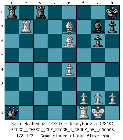 Last move : 1/2-1/2 2022 September 17 13:49:32 [Event "FICGS__CHESS__CUP_STAGE_1_GROUP_08__000005"] [Site "FICGS"] [Date "2022.07.16"] [Round "1"] [White "Swiatek,Janusz"] [Black "Gray,Garvin"] [Result "1/2-1/2"] [WhiteElo "2224"] [BlackElo "2310"] 1.d4 Nf6 2.c4 g6 3.Nc3 d5 4.Nf3 Bg7 5.cxd5 Nxd5 6.e4 Nxc3 7.bxc3 c5 8.Rb1 O-O 9.Be2 cxd4 10.cxd4 Qa5+ 11.Bd2 Qxa2 12.O-O Bg4 13.Be3 Nc6 14.d5 Bxf3 15.Bxf3 Ne5 16.Rxb7 a5 17.Be2 Rfe8 18.Bc5 a4 19.Bb5 Rec8 20.Bxe7 a3 21.d6 Qe6 22.d7 a2 23.Qd5 Nxd7 24.Qxe6 fxe6 25.Bxd7 a1Q 26.Bxe6+ Kh8 1/2-1/2 King's Indian defense, 3.Nc3 Kingside Castling by player Black (move 8) Kingside Castling by player White (move 12) Promotion Queen by player Black (move 25) This chess game ended in a draw. Follow this game move after move (download)Chess is no whit inferior to the violin, and we have a large number of professional violinists. (Mikhail Botvinnik) Im Schach nämlich geht es darum, daß Ich des Gegners klein zu kriegen, sein Ego zu zerbrechen und zu zermahlen, seine Selbstachtung zu zertreten und zu verscharren und seine ganze mißachtenswerte sogenannte Persönlichkeit ein für alle Mal tot zu hacken und zu zerstampfen und dadurch die menschliche Gesellschaft von einer stinkenden Pestbeule zu befreien. Es ist ein königliches Spiel. (Robert James Fischer) ¿Se han dado cuenta de que Fischer casi nunca ha tenido piezas malas? El las intercambia y las piezas malas se quedan con sus oponenets. (Yuri Balashov) La conception d'un plan est le processus par lequel un joueur exploite les avantages de sa position tout en s'efforçant d'en réduire au minimum les inconvénients. Afin de garantir le succès, un plan doit toujours se fonder sur un diagnostic objectif des particularités d'une position. La conception d'un plan est d'autant plus difficile que la position est équilibrée, et grandement facilitée lorsqu'il n'existe qu'un seul plan susceptible de répondre aux exigences de la position. (Harry Golombek) Creativity is inventing, experimenting, growing, taking risks, breaking rules, making mistakes, and having fun. (Mary Lou Cook)