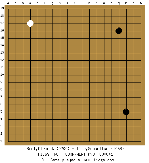 Last move : 1-0 2007 September 3 18:59:30 [Event "FICGS__GO__TOURNAMENT_KYU__000041"] [Site "FICGS"] [Date "2007.08.03"] [Round "1"] [Black "Beni,Clement"] [White "Ilie,Sebastian"] [Result "1-0"] [Rating 1 "0700"] [Rating 2 "1068"] 1.q16 d17 2.r5 1-0 This go game has been lost on time (started : 2007.08.03 11:16:18) Here are the names of the openings (joseki) played in the four corners : Corner q4 : r5 1-0 Mokuhazushi (Waemok, Wai`mu`) 5-3 Point. The mokuhazushi (5-3) point was popular in the Edo period in Japan (1600 - 1867). It emphasizes influence; territorially, it is inferior to the 3-4 point. Player Black won this Go (weiqi, baduk) game. Follow this game move after move (download)If you don't know ladders, don't play go. (Anonymous) If we knew what we were doing, we would not call it research. (Albert Einstein)