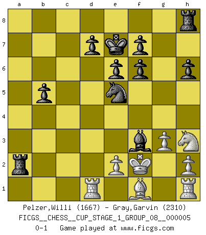 Last move : 0-1 2022 September 7 9:48:41 [Event "FICGS__CHESS__CUP_STAGE_1_GROUP_08__000005"] [Site "FICGS"] [Date "2022.07.16"] [Round "1"] [White "Pelzer,Willi"] [Black "Gray,Garvin"] [Result "0-1"] [WhiteElo "1667"] [BlackElo "2310"] 1.d4 Nf6 2.c4 e6 3.Nc3 Bb4 4.Bg5 c5 5.a3 Bxc3+ 6.bxc3 h6 7.Bh4 Qa5 8.Rc1 cxd4 9.Bxf6 gxf6 10.Qxd4 Qxa3 11.Rd1 Ke7 12.c5 Nc6 13.Qc4 b5 14.cxb6 Ba6 15.Qf4 Qxc3+ 16.Qd2 Qxd2+ 17.Rxd2 axb6 18.g3 Bb7 19.Rd1 Ne5 20.f3 b5 21.Kf2 Ra2 22.Nh3 Bxf3 0-1 Nimzo-Indian : Leningrad variation Player Black won this chess game. Follow this game move after move (download)Examine moves that smite! A good eye for smites is far more important than a knowledge of strategical principles. (Purdy) Aljechin war kein Nazi. Er war ein Opportunist. Ein schrecklicher Mann. Er liebte Geld über alles und würde für Geld ein Jude, ein Katolik oder ein Protestant werden. (Miguel Najdorf) La maestría del Ajedrez consiste esencialmente en analizar posiciónes de Ajedrez con precisión. (Mikhail Botvinnik) Toutes les manuvres exécutées sur une colonne ouverte ont pour but ultime l'intrusion définitive sur la septième ou la huitième rangée, en plein cur de la position ennemie. (Aaron Nimzovitch) The Movers & Shakers of this world are those who play chess in the mornings and go to the disco in the evenings. (Dinesh De Silva)