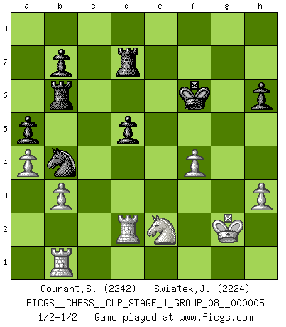 Last move : 1/2-1/2 2022 September 12 21:1:28 [Event "FICGS__CHESS__CUP_STAGE_1_GROUP_08__000005"] [Site "FICGS"] [Date "2022.07.16"] [Round "1"] [White "Gounant,Stanislas"] [Black "Swiatek,Janusz"] [Result "1/2-1/2"] [WhiteElo "2242"] [BlackElo "2224"] 1.d4 Nf6 2.c4 e6 3.g3 Be7 4.Nf3 O-O 5.Bg2 d5 6.O-O dxc4 7.Qc2 a6 8.a4 Bd7 9.Qxc4 Bc6 10.Bf4 Bd6 11.Qc1 h6 12.Nc3 Nd5 13.Nxd5 Bxd5 14.Re1 f5 15.Bxd6 cxd6 16.Nh4 Bxg2 17.Nxg2 Qd7 18.Qc4 Rc8 19.Qb3 Nc6 20.Red1 Qf7 21.e3 Re8 22.d5 exd5 23.Qxd5 Rad8 24.Nf4 Re5 25.Qxf7+ Kxf7 26.Rd2 g5 27.Ne2 Re4 28.b3 Rb4 29.Rd3 Rb6 30.Rc1 d5 31.h3 Kf6 32.Kg2 Rd6 33.Nc3 Ke6 34.Ne2 Kf6 35.Rcd1 Nb4 36.Rd4 Nc6 37.R4d3 Nb4 38.R3d2 Nc6 39.Rb1 Rd8 40.g4 Rb4 41.gxf5 Kxf5 42.Rd3 Ke5 43.Rd2 Rb6 44.Kf1 Rd6 45.Kg2 Kf6 46.Nd4 Rd7 47.Ne2 Ke5 48.Rd3 Ne7 49.Nd4 Nc6 50.Ne2 Nb4 51.Rd4 Nc6 52.f4+ gxf4 53.exf4+ Kf6 54.Rd3 Nb4 55.Rd4 a5 56.Rd2 1/2-1/2 Catalan Opening Kingside Castling by player Black (move 4) Kingside Castling by player White (move 6) This chess game ended in a draw. Follow this game move after move (download)When you don't know what to play, wait for an idea to come into your opponent's mind. You may be sure that idea will be wrong. (Siegbert Tarrasch) Der Verteidiger gebe der Gewalt nach, aber nur der Gewalt. Er schaffe sich nicht freiwillig, etwa aus Blindheit oder aus Schrecken, irgendwelche Schwächen. Er lasse sich nicht bluffen. (Emanuel Lasker) Bobby Fischer es el jugador de Ajedrez mas grande que jamás haya existido. (Ken Smith) Il n'y a pas de prix trop élevé au scalp de l'ennemi. (Koblentz) I'm extremely disappointed. I send you out for exciting, new designer drugs, you come back with tomato sauce. (Gregory House, House M.D.)