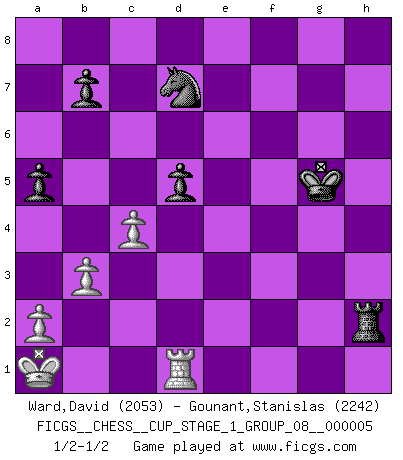Last move : 1/2-1/2 2022 August 10 4:59:14 [Event "FICGS__CHESS__CUP_STAGE_1_GROUP_08__000005"] [Site "FICGS"] [Date "2022.07.16"] [Round "1"] [White "Ward,David"] [Black "Gounant,Stanislas"] [Result "1/2-1/2"] [WhiteElo "2053"] [BlackElo "2242"] 1.e4 c6 2.d4 d5 3.Nd2 dxe4 4.Nxe4 Bf5 5.Ng3 Bg6 6.Nf3 Nd7 7.h4 h6 8.h5 Bh7 9.Bd3 Bxd3 10.Qxd3 e6 11.Bd2 Ngf6 12.O-O-O Be7 13.Kb1 Qb6 14.c4 O-O 15.Rhe1 Rfd8 16.Nf5 Bb4 17.Nxh6+ gxh6 18.g4 Qa5 19.Bxb4 Qxb4 20.g5 hxg5 21.Nxg5 Qf8 22.f4 Kh8 23.h6 Qg8 24.Ka1 Qg6 25.Qxg6 fxg6 26.Nf7+ Kh7 27.Nxd8 Rxd8 28.Rxe6 Kxh6 29.Re7 a5 30.Rf7 g5 31.fxg5+ Kxg5 32.Re7 Rh8 33.b3 Rh2 34.d5 cxd5 35.Rxd7 Nxd7 1/2-1/2 Caro-Kann : 3.Nd2 Queenside Castling by player White (move 12) Kingside Castling by player Black (move 14) This chess game ended in a draw. Follow this game move after move (download)It is difficult to play against Einstein's theory --on his first loss to Fischer. (Mikhail Tal) Offensichtlich kennt Kasparow nichts anderes als Schach, und ich könnte 500 weitere Spieler dieser Sorte benennen. (Judith Polgar) Un Peón pasado es un criminal, quién debe ser mantenido bajo candado y llave. Leves medidas, tales como vigilancia policiaca, no son suficientes. (Aaron Nimzovich) Le génie consiste à savoir transgresser les règles au moment opportun. (Teichmann) The faster the computer, the slower the brain. (Thibault de Vassal)