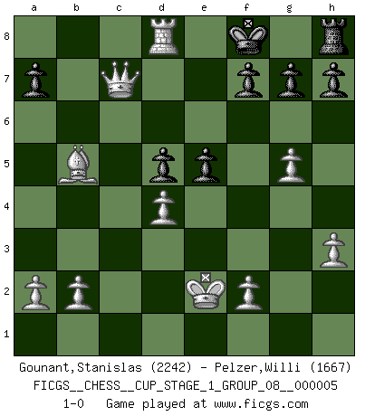 Last move : 1-0 2022 September 6 21:42:30 [Event "FICGS__CHESS__CUP_STAGE_1_GROUP_08__000005"] [Site "FICGS"] [Date "2022.07.16"] [Round "1"] [White "Gounant,Stanislas"] [Black "Pelzer,Willi"] [Result "1-0"] [WhiteElo "2242"] [BlackElo "1667"] 1.d4 d5 2.c4 c6 3.Nf3 Nf6 4.e3 Bg4 5.h3 Bh5 6.g4 Bg6 7.Ne5 Bxb1 8.Rxb1 Qa5+ 9.Bd2 Qc7 10.g5 Ne4 11.cxd5 cxd5 12.Rc1 Nc6 13.Nxc6 bxc6 14.Bb5 Rc8 15.Qa4 Nxd2 16.Rxc6 Nf3+ 17.Ke2 Nxd4+ 18.exd4 Kd8 19.Rhc1 e5 20.Qa5 Bd6 21.Rxd6+ Ke7 22.Rxc7+ Rxc7 23.Qxc7+ Kf8 24.Rd8+ 1-0 QGD Slav : 4.e3 Player White won this chess game. Follow this game move after move (download)Is Bobby Fischer quite sane ? (Salo Flohr) Die Arbeit ist etwas Unnatürliches. Die Faulheit allein ist göttlich. (Anatole France) El Ajedrez es en su esencia, un juego. En su forma, un arte. Y en su ejecución, una ciencia. (Baron Tassilo) Botvinnik disait en comparant les échecs à la musique: Il existe une science dont le but est l'étude de l'acoustique et des sons. Mais il y a aussi un art qui se sert de l'océan des sons : c'est la musique. De toute évidence, il en est de même pour la pensée. La logique est l'étude des lois de la réflexion et les échecs reflètent, en tant qu'art, le côté logique de la réflexion, sous la forme d'images artistiques... Extrait de Fischer - Spassky, Reykjavik 1972 par Alexander & F. Wyndham (Ed. Solar), p 37. The beginning is the most important part of the work. (Plato)