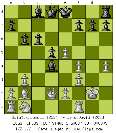 Last move : 1/2-1/2 2022 August 5 7:28:45 [Event "FICGS__CHESS__CUP_STAGE_1_GROUP_08__000005"] [Site "FICGS"] [Date "2022.07.16"] [Round "1"] [White "Swiatek,Janusz"] [Black "Ward,David"] [Result "1/2-1/2"] [WhiteElo "2224"] [BlackElo "2053"] 1.d4 Nf6 2.c4 e6 3.Nf3 b6 4.g3 Ba6 5.b3 d5 6.Bg2 Nbd7 7.O-O Rc8 8.cxd5 exd5 9.Ne5 c6 10.Bh3 Nxe5 11.dxe5 Ne4 12.f3 Bc5+ 13.Kg2 Ng5 14.Bxc8 Bxc8 15.h4 Ne6 16.Qd2 Bd4 17.Bb2 Nf4+ 18.gxf4 1/2-1/2 Queen's Indian : Nimzovich variation (exaggerated Fianchetto) Kingside Castling by player White (move 7) This chess game ended in a draw. Follow this game move after move (download)Who is your opponent tonight, tonight I am playing against the Black pieces. (Akiba Rubinstein) Jeder weiß, dass Gasprom Putins persönliches Machtinstrument ist. Die Firma wird vom Kreml aus geleitet und wird schon deshalb nie transparent sein. (Garry Kasparov) Aquel que ve no otra dirección en el juego que la de dar Jaque Mate a su oponente, nunca será un buen jugador de Ajedrez. (Euwe) Je fais ceci parce que dans cinquante coups j'obtiendrai cela; je m'appelle Mikhail Moisevitch Botvinnik. (Botvinnik) When you've done things right people won't know you've done anything at all. (Futurama)