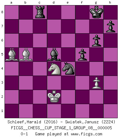Last move : 0-1 2022 September 13 19:15:24 [Event "FICGS__CHESS__CUP_STAGE_1_GROUP_08__000005"] [Site "FICGS"] [Date "2022.07.16"] [Round "1"] [White "Schleef,Harald"] [Black "Swiatek,Janusz"] [Result "0-1"] [WhiteElo "2016"] [BlackElo "2224"] 1.e4 c5 2.d3 Nc6 3.g3 g6 4.Bg2 Bg7 5.f4 b5 6.Nh3 d6 7.O-O Rb8 8.Nc3 e6 9.e5 Nge7 10.exd6 Qxd6 11.Be3 f5 12.a4 a6 13.axb5 axb5 14.Ng5 Nd4 15.Bf2 O-O 16.Re1 Rd8 17.Nf3 Nec6 18.Nxd4 Nxd4 19.Nb1 b4 20.c3 Nb5 21.Qc2 Bd7 22.Rc1 Be8 23.Qe2 e5 24.fxe5 Bxe5 25.Nd2 Bf7 26.Nf3 Bg7 27.Qe1 Bd5 28.Ra5 Bh6 29.Rc2 Bb3 30.Re2 bxc3 31.bxc3 Qxd3 32.Re5 Nxc3 33.Be3 Bg7 34.Raxc5 Qd1 35.Bf4 Bxe5 36.Bxe5 Ne4 37.Rc1 Rbc8 38.Qxd1 Rxd1+ 39.Rxd1 Bxd1 40.Nd4 Ba4 41.Bf1 Rc1 42.Kg2 Bc6 43.Be2 Bd5 44.h3 Ng5 45.Kf2 Nxh3+ 46.Ke3 Rc3+ 47.Kd2 Rc8 48.Bd3 Re8 49.Bc7 Nf2 50.Bb5 Rc8 51.Ba5 Ne4+ 0-1 Sicilian defense Kingside Castling by player White (move 7) Kingside Castling by player Black (move 15) Player Black won this chess game. Follow this game move after move (download)I thought the most common mistake [in chess] was the first one: Learning the game :P (Garvin Gray, FICGS forum) Als er Schachweltmeister wurde ließ er praktisch alle stärksten Sovietspieler für sich arbeiten. Wenn ein auch nur mittelmässiger Meister ein Spezialist für eine bestimmte Eröffnung war, wurde er von Karpov gerufen. Das wurde alles geheim gehalten. (Mikhail Moiseyevich Botvinik) Me siento como si fuera una pieza en una partida de Ajedrez, cuando mi oponente me indica: esa pieza no puede ser movida. (Soren Kierkegaard) A chaque perte on perd un peu de soi. (Joël Lautier) Computers have lots of memory but no imagination. (Anonymous)