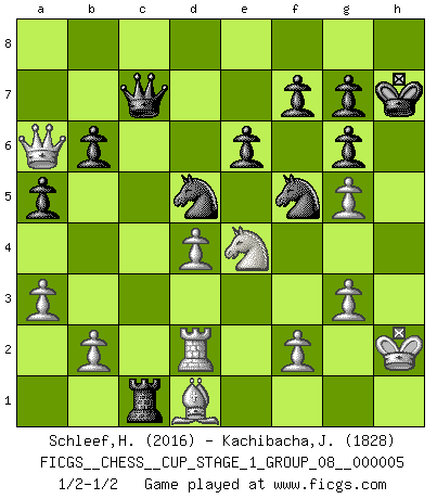 Last move : 1/2-1/2 2022 October 7 13:42:12 [Event "FICGS__CHESS__CUP_STAGE_1_GROUP_08__000005"] [Site "FICGS"] [Date "2022.07.16"] [Round "1"] [White "Schleef,Harald"] [Black "Kachibacha,Jobadi"] [Result "1/2-1/2"] [WhiteElo "2016"] [BlackElo "1828"] 1.d4 d5 2.c4 c6 3.Nf3 Nf6 4.e3 Bf5 5.Nc3 e6 6.Nh4 Bg6 7.Nxg6 hxg6 8.a3 Nbd7 9.g3 Be7 10.Bd3 O-O 11.h4 dxc4 12.Bxc4 c5 13.O-O Rc8 14.Be2 cxd4 15.exd4 Nb6 16.Bf3 Nfd5 17.Ne4 Qd7 18.Bg5 Rc7 19.Re1 Nc4 20.Re2 Rfc8 21.Kg2 b6 22.Qb3 Bxg5 23.hxg5 Na5 24.Qd3 Nc6 25.Rd1 Qd8 26.Red2 Nce7 27.Qb1 Nf5 28.Be2 Rc2 29.Rxc2 Rxc2 30.Bd3 Rc8 31.Be2 Qc7 32.Qd3 Qc6 33.Rd2 Qd7 34.Rd1 Rc2 35.Rd2 Rc1 36.Bf1 Qc7 37.Kg1 Qd8 38.Kh2 a5 39.Be2 Qc7 40.Qa6 Kh7 41.Bd1 1/2-1/2 QGD Slav : 4.e3 Bf5 Kingside Castling by player Black (move 10) Kingside Castling by player White (move 13) This chess game ended in a draw. Follow this game move after move (download)A good sacrifice is one that is not necessarily sound but leaves your opponent dazed and confused. (Rudolph Spielmann) Das Schachspiel hat wie die Liebe, die Musik, die Fähigkeit, den Menschen glücklich zu machen. Ich habe ein leises Gefühl des Bedauerns für jeden, der das Schachspiel nicht kennt, so wie ich jeden bedaure, der die Liebe nicht kennt. (Siegbert Tarrasch) Coloca el contenido del tablero de Ajedrez en un sombrero, agita las piezas vigorosamente, derrámalas en el tablero desde una altura de medio metro y así obtienes el estilo de Wilhelm Steinitz. (H. E. Bird) J'apprécie les joueurs d'est-indienne, c'est grâce à eux que je nourris ma famille depuis tant d'années. (Petrosian) There are more things in heaven and earth than practically anywhere else. (Unknown)