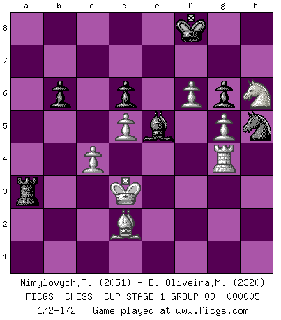 Last move : 1/2-1/2 2022 November 4 9:30:53 [Event "FICGS__CHESS__CUP_STAGE_1_GROUP_09__000005"] [Site "FICGS"] [Date "2022.07.16"] [Round "1"] [White "Nimylovych,Taras"] [Black "B. Oliveira,Marcio"] [Result "1/2-1/2"] [WhiteElo "2051"] [BlackElo "2320"] 1.e4 c5 2.Nf3 d6 3.d4 cxd4 4.Nxd4 Nf6 5.Nc3 a6 6.Be3 e5 7.Nb3 Be6 8.f3 h5 9.Qd2 Nbd7 10.Nd5 Bxd5 11.exd5 g6 12.Be2 Qc7 13.Rd1 Bg7 14.O-O b6 15.c4 O-O 16.Kh1 Nc5 17.Na1 a5 18.Nc2 Qd7 19.b3 Rae8 20.Rg1 Kh7 21.Rdf1 h4 22.Bg5 Rh8 23.Bxh4 e4 24.Be1 Kg8 25.f4 a4 26.Qd1 axb3 27.axb3 Nxb3 28.Ne3 Nc5 29.g4 Ra8 30.Rg2 Qa4 31.Qxa4 Rxa4 32.g5 Nh5 33.f5 Bd4 34.Ng4 Nd3 35.Bd2 Kg7 36.f6+ Kh7 37.Nh6 Rha8 38.Bxd3 exd3 39.Rg4 Ra1 40.Rxa1 Rxa1+ 41.Kg2 Be5 42.Kf3 Ra2 43.Be3 d2 44.Ke2 Bxh2 45.Nxf7 Kg8 46.Nh6+ Kf8 47.Kd1 Be5 48.Bxd2 Ra1+ 49.Kc2 Ra2+ 50.Kd3 Ra3+ 51.Kc2 Ra2+ 52.Kd3 Ra3+ 1/2-1/2 Sicilian : Najdorf, Byrne (English) attack Kingside Castling by player White (move 14) Kingside Castling by player Black (move 15) This chess game ended in a draw. Follow this game move after move (download)Nonsense was the last thing Fischer was interested in, as far as Chess was concerned. (Elie Agur) Schach ist wie eine schöne Frau, zu der wir ständig zurückkehren, gleichviel, wie oft sie uns zurückweist. (Anonymous) Un juego de Ajedrez es un dialogo, una conversación entre un jugador y su oponente. Cada movimiento del oponente puede contener amenazas o tropiezos, pero un jugador no se puede defender de las amenazas o tomar ventaja de los tropiezos si es que no se pregunta a sí mismo: ¿Que es lo que mi oponente va a hacer después de cada movida?. (Bruce A. Moon) C'est la seule position que je connaisse où les deux camps sont mals. Propos prêtés à V. Anand. My poor ole parrot... Is not in the circulation of displays ....poo hoo hoo :) (Wayne Lowrance's enigma)