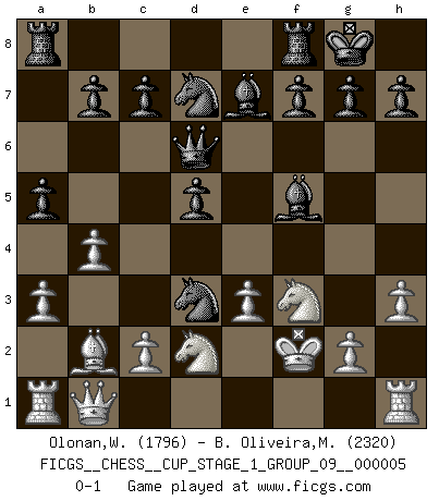 Last move : 0-1 2022 September 8 5:30:53 [Event "FICGS__CHESS__CUP_STAGE_1_GROUP_09__000005"] [Site "FICGS"] [Date "2022.07.16"] [Round "1"] [White "Olonan,Wilfredo Olanka"] [Black "B. Oliveira,Marcio"] [Result "0-1"] [WhiteElo "1796"] [BlackElo "2320"] 1.d4 Nf6 2.a3 d5 3.h3 Bf5 4.f3 Nh5 5.Kf2 Qd6 6.f4 Nxf4 7.e3 Ng6 8.Nd2 e5 9.dxe5 Nxe5 10.Ngf3 Nbd7 11.b4 Be7 12.Bb2 O-O 13.Qb1 a5 14.Bd3 Nxd3+ 0-1 This chess game has been lost on time (started : 2022.07.16 1:8:9) Queen's pawn game Kingside Castling by player Black (move 12) Player Black won this chess game. Follow this game move after move (download)You must take your opponent into a deep dark forest where 2+2=5, and the path leading out is only wide enough for one. (Mikhail Tal) Das Schach hält seine Meister in eigenen Banden, Fesseln; auf vielerlei Weise formt es ihren Geist, so dass die innere Freiheit selbst des Stärksten beeinflusst wird. (Albert Einstein) Aquel que ve no otra dirección en el juego que la de dar Jaque Mate a su oponente, nunca será un buen jugador de Ajedrez. (Euwe) Le pion, dans sa simplicité, marche droit devant lui, mais lorsqu'il prend, il le fait obliquement? Ainsi l'homme, tant qu'il reste pauvre, marche dans la droiture et vit honnêtement, mais lorsqu'il recherche les honneurs, il flatte, se parjure et, par les voies obliques, cherche une position supérieure sur l'échiquier du monde. (Jean de Galles) The difference between perseverance and obstinacy is that one comes from a strong will, and the other from a strong won't. (Henry Ward Beecher)