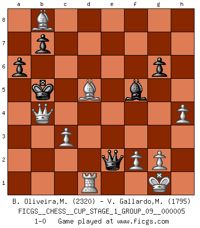 Last move : 1-0 2022 August 31 18:23:13 [Event "FICGS__CHESS__CUP_STAGE_1_GROUP_09__000005"] [Site "FICGS"] [Date "2022.07.16"] [Round "1"] [White "B. Oliveira,Marcio"] [Black "V. Gallardo,Miguel"] [Result "1-0"] [WhiteElo "2320"] [BlackElo "1795"] 1.d4 Nf6 2.c4 d5 3.Nf3 e6 4.Nc3 Bb4 5.Bg5 Nc6 6.e3 O-O 7.Rc1 Re8 8.a3 Bxc3+ 9.Rxc3 dxc4 10.Bxc4 a6 11.Bd3 h6 12.Bh4 Ne7 13.O-O Nfd5 14.Rc1 c6 15.Bb1 Qc7 16.e4 Nb6 17.Rc3 Ng6 18.Bg3 Qe7 19.h4 h5 20.e5 Nd5 21.Ng5 Nxc3 22.bxc3 Qxa3 23.Qxh5 Kf8 24.Nxf7 Kxf7 25.Bxg6+ Ke7 26.Bxe8 Kd8 27.Qh8 Qe7 28.Bxc6 Kc7 29.Be4 Rb8 30.d5 exd5 31.e6 Kc6 32.Bxb8 Bxe6 33.Bf3 Bf5 34.Rd1 g6 35.Bxd5+ Kb5 36.Qd4 Qe2 37.Qb4+ 1-0 Queen's pawn game Kingside Castling by player Black (move 6) Kingside Castling by player White (move 13) Player White won this chess game. Follow this game move after move (download)Via the squares on the chessboard, the Indians explain the movement of time and the age, the higher influences which control the world and the ties which link Chess with the human soul. (Al-Masudi) Charakterschwächen offenbaren sich normalerweise während einer Schachpartie. (Garry Kasparov) Cuando tu casa esta en llamas, no puedes ser molestado por tus vecinos. O, como decinos en Ajedrez, si tu Rey esta bajo ataque, no te preocupa perder un Peón del lado de la Reina. (Gary Kasparov) Le génie consiste à savoir transgresser les règles au moment opportun. (Teichmann) Lottery : A tax on people who are bad at math. (Author unknown)