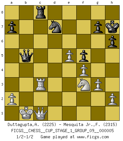 Last move : 1/2-1/2 2022 November 19 17:51:21 [Event "FICGS__CHESS__CUP_STAGE_1_GROUP_09__000005"] [Site "FICGS"] [Date "2022.07.16"] [Round "1"] [White "Duttagupta,Aniruddha"] [Black "Mesquita Jr.,Fausto Monteiro"] [Result "1/2-1/2"] [WhiteElo "2225"] [BlackElo "2315"] 1.d4 Nf6 2.c4 e6 3.Nc3 Bb4 4.Qc2 O-O 5.e4 d5 6.e5 Ne4 7.Bd3 c5 8.Nf3 cxd4 9.Nxd4 Nd7 10.Bf4 Qh4 11.g3 Qh3 12.O-O-O Nxc3 13.bxc3 Ba3+ 14.Kb1 Nb6 15.Bf1 Qh5 16.Be2 Qg6 17.Bd3 f5 18.cxd5 Nxd5 19.Bc1 Bxc1 20.Rxc1 Bd7 21.Ka1 Rac8 22.Qb2 Rc7 23.c4 Nb6 24.c5 Nd5 25.Bc4 Bc6 26.f4 Rd7 27.Rhd1 h6 28.Rd3 Kh7 29.Rc2 Rc8 30.Rcd2 Rdc7 31.Qa3 b6 32.cxb6 Nxb6 33.Bxe6 Bd7 34.Bxd7 Nxd7 35.Rb2 Rc1+ 36.Rb1 Rxb1+ 37.Kxb1 Qh5 38.Nf3 Qh3 39.Rc3 Qf1+ 40.Qc1 Qb5+ 1/2-1/2 Nimzo-Indian : Classical variation Kingside Castling by player Black (move 4) Queenside Castling by player White (move 12) This chess game ended in a draw. Follow this game move after move (download)Pawn endings are to Chess what putting is to golf. (Cecil Purdy) Sicherlich können nur Meister einen Stil haben. Daß ein nicht-Meister auch nur ein einziges Mal in seinem Leben eine Partie folgerecht durchführte, habe ich niemals bemerkt. (Emanuel Lasker) Un entendimiento minucioso de las típicas continuaciones de mate hacen de las mas complicadas combinaciones de sacrificio que conducen hacia ellas no solo no dificiles, sino casi un asunto de rutina. (Siegbert Tarrasch) Je ne crois pas en la psychologie, je crois aux bons coups. (Robert Fischer) No, I am still playing. (Anatoly Karpov)